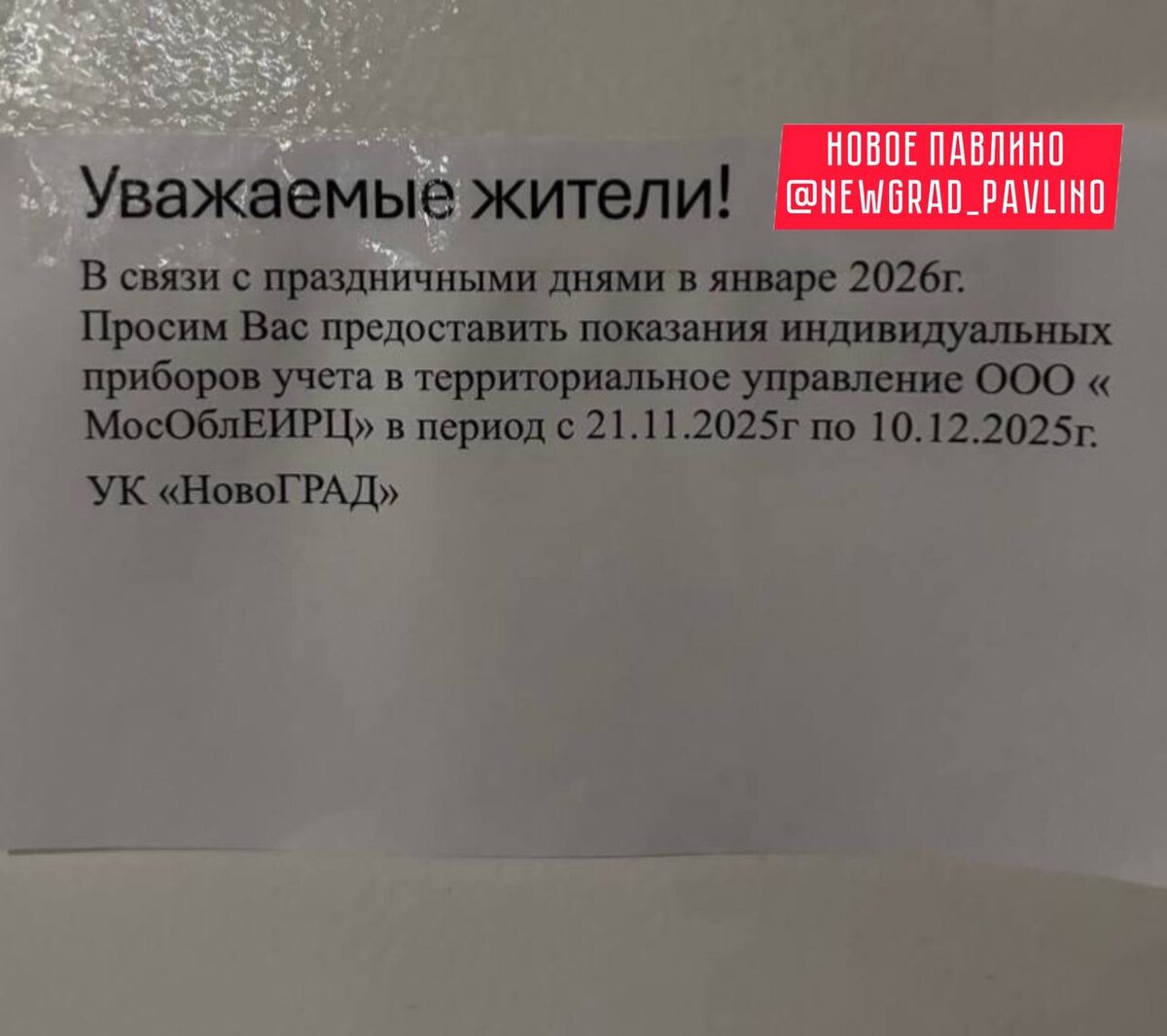 УК Новоград просит заранее подать показания в декабре Чуть позже они и оплату попросят пораньше, как это бывает каждый год. Мы в 📲 max.ru/newgrad_pavlino ⚠️НОВОЕ ПАВЛИНО 🆕🆕🆕🆕🆕🆕🍴 Прислать новость|Подписаться ❤️