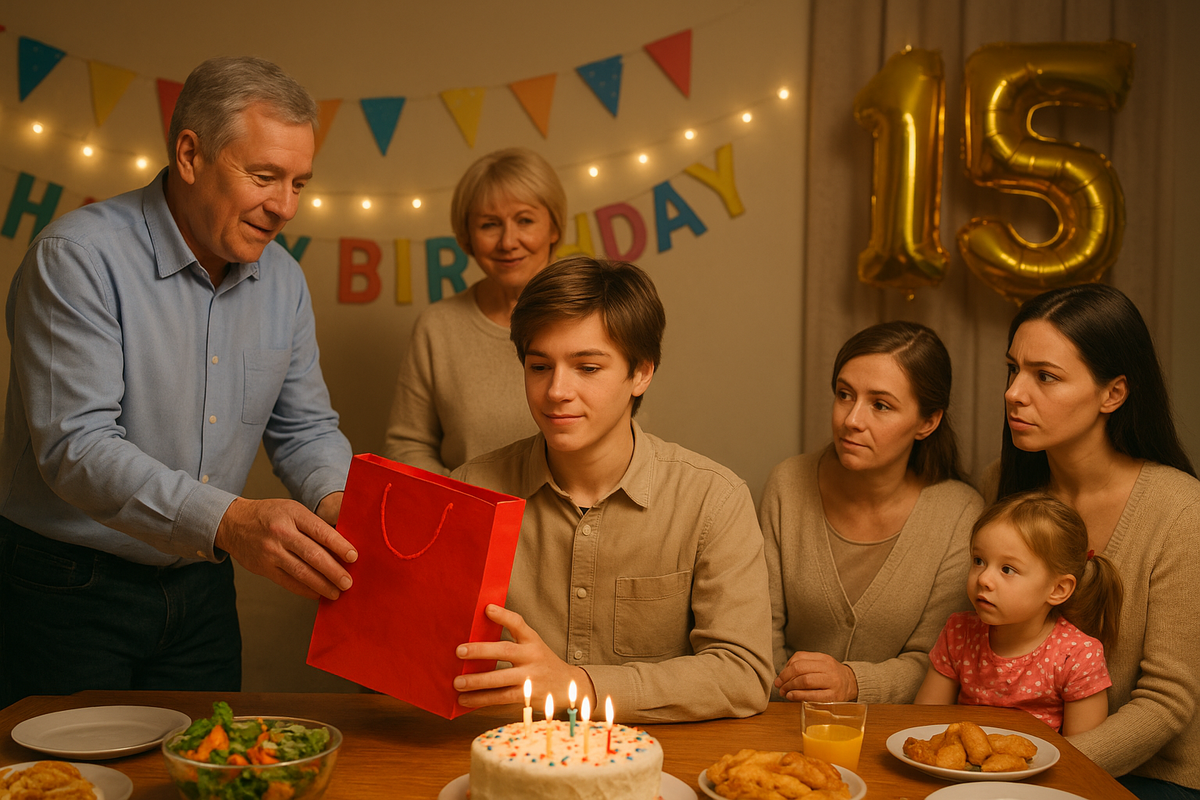 На прошлой неделе мой старший сын Артём справлял своё пятнадцатилетие. Мы с мужем заранее решили, что отмечать будем дома — по-семейному, без лишнего шума. Я приготовила несколько его любимых блюд, заказала торт, муж украсил комнату гирляндами. Казалось, всё будет спокойно и тепло. Свёкор с свекровью ещё за день до праздника звонили и сказали, что подготовили Артёму какой-то «особенный сюрприз». Мы тогда переглянулись с мужем: ну что там может быть? Часы, беспроводные наушники, колонка… что-то из техники, как они любят. Но всё оказалось куда серьёзнее, чем мы предполагали. Праздник начался очень душевно. За столом было оживлённо и шумно: Артём делился смешными историями из школы, наш младший Ваня — ему всего четыре — то падал со стула, то смеялся над собственными шутками, а свекровь, как обычно, вздыхала про «ужасную влажность в этом году». Кроме них приехала и сестра мужа — Олеся. Она явилась с дочкой Соней, которой недавно исполнилось семь. Девочка была, как всегда, в ярком плат