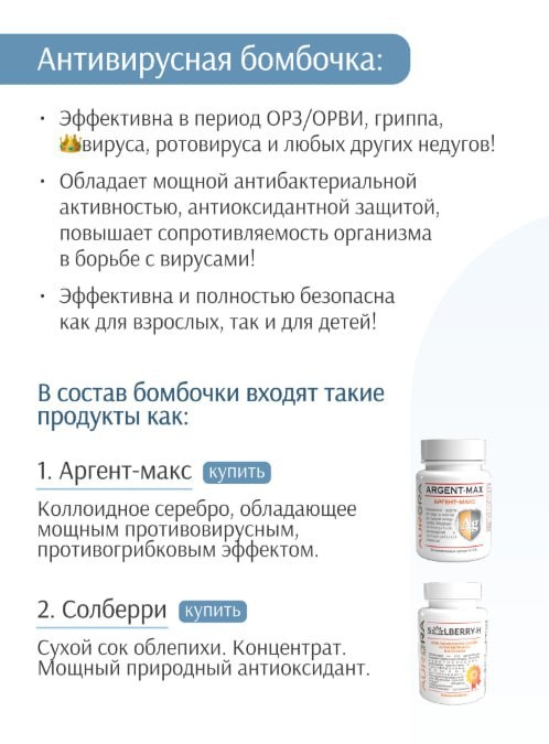 🚨Переходный сезон всегда проверяет иммунитет на прочность: перепады температуры, меньше солнца, больше стресса — и вирусы не дремлют. Поэтому я всегда рекомендую иметь под рукой проверенные средства, которые помогут быстро восстановиться, если почувствовали слабость, першение в горле или ломоту в теле. ⠀ 💣 Антиоксидантный коктейль «Бомбочка» — это мой must-have в осенней аптечке. Он работает на уровне клеток: помогает организму быстрее справиться с воспалением, поддерживает иммунную систему и даёт энергию, когда чувствуешь, что заболеваешь. ✨ Что внутри и как работает: КОР-АЛЛ® (CORE-ALL®) — источник природных антиоксидантов, помогает защитить клетки от свободных радикалов и поддерживает иммунитет. Аргент-Макс (Argent-Max) — серебро в ионной форме, природный антисептик с противовирусным действием. Си-Энерджи Экстра (Si-Energy Extra) — мощный антиоксидант на основе зелени пихты и кремния, поддерживает сосуды и дыхательную систему. Солберри-H (Solberry-H) — концентрат из ягод с в