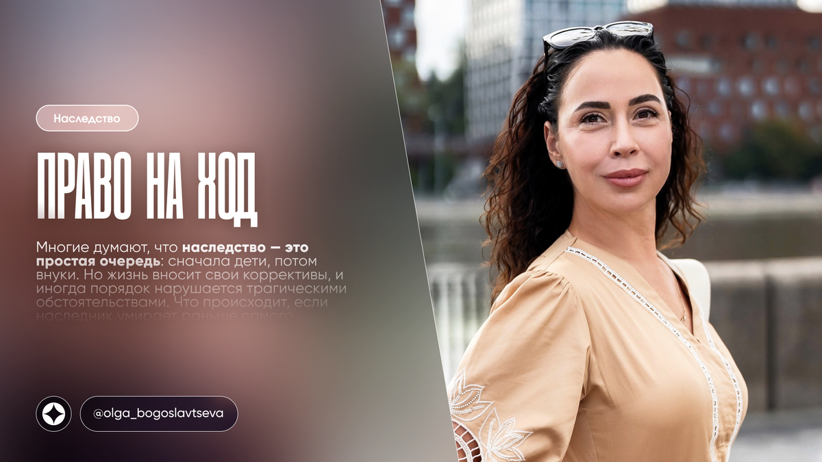 С вами Ольга Богославцева, ваш адвокат по наследственным делам. Сегодня мы разберем одну из самых драматичных и часто встречающихся тем в моей практике — право представления. Но жизнь вносит свои коррективы, и иногда порядок нарушается трагическими обстоятельствами. Что происходит, если наследник умирает раньше самого наследодателя? Теряют ли его дети право на имущество бабушек и дедушек? Давайте разбираться без сложных терминов, на живых примерах. Представьте себе очередь в кассу. Стоит отец, за ним — его дети. Если отец по какой-то причине уходит из очереди (в нашем случае — умирает раньше дедушки/бабушки), его место не исчезает. На это место встают его дети (внуки наследодателя). По закону (ст. 1146 ГК РФ), доля наследника, умершего до открытия наследства или одновременно с наследодателем, переходит к его потомкам. 1. Внуков и их потомков (заменяют умерших детей).