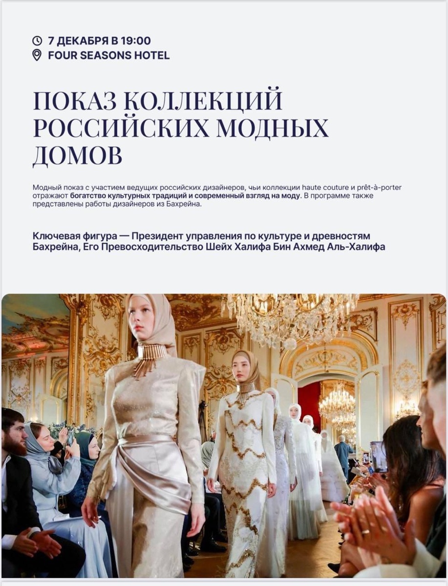 БАХРЕЙН: 7-9 декабря Уже совсем скоро пройдет Показ коллекций российских модных домов в роскошных залах Four Seasons Hotel в Бахрейне 🕯 Мероприятие носит международный характер и символический смысл, ведь оно приурочено к 35-летию дипломатических отношений между нашими странами 🌍 Особый акцент этого вечера — участие дизайнеров из Бахрейна. Присутствие Его Превосходительства Шейха Халифы Бин Ахмеда Аль-Халифа, Президента управления по культуре и древностям Бахрейна, лишь подчеркивает высокий статус и международную значимость этого события 🔥 Все подробности участия в личных сообщениях! 💌 #ЕленаМелякина #Показ
