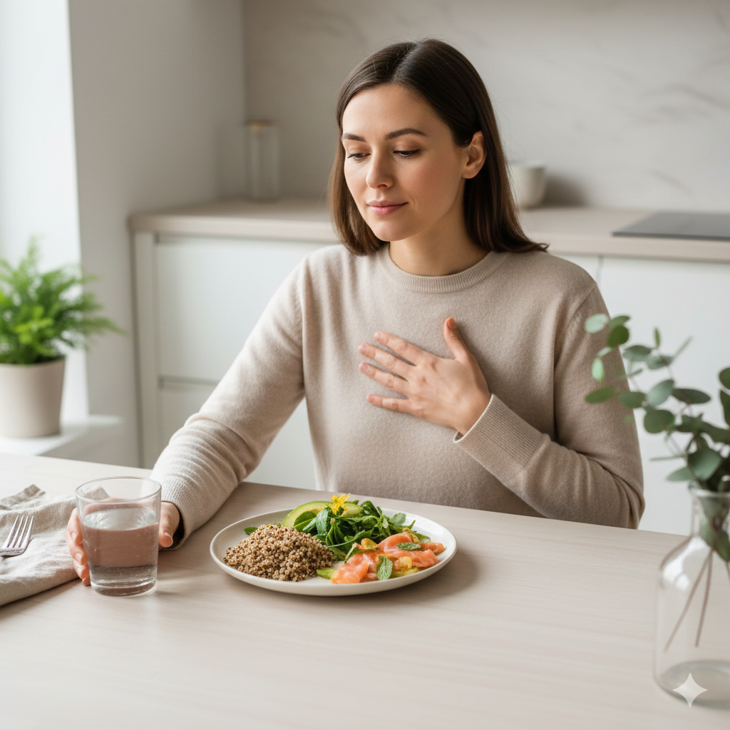 Сколько раз ты садилась обедать с мыслью «съем немного» — а в итоге вставала из-за стола с тяжестью в животе? Или перекусывала яблоком, а через полчаса снова хотела есть? Или ела ужин, понимая, что уже сыта, но продолжала, потому что «ну ещё кусочек, он же вкусный»? Все вокруг твердят про силу воли и контроль. Но проблема не в том, что ты слабовольная. Проблема в том, что сигналы насыщения сломаны. И сегодня разберёмся, почему это происходит и как это починить. За ощущение голода и сытости отвечают два гормона: грелин (я хочу есть) и лептин (я наелась, хватит). В идеальном мире они работают слаженно — грелин растёт перед едой, лептин поднимается после, и ты спокойно выходишь из-за стола сытой. Но вот что ломает эту систему: Хочешь чувствовать насыщение? Добавь белок и полезные жиры. Это не просто совет из интернета, это биохимия. Белок замедляет опорожнение желудка, даёт долгое чувство сытости и стимулирует выработку гормонов насыщения. Съела омлет с авокадо — и три часа спокойно работ
