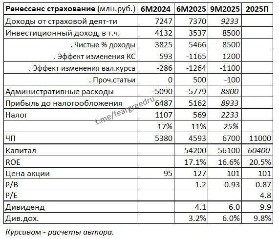 #отчетность #портфель $RENI Ренессанс страхование - разбор отчета за 9 мес. 2025 Ренессанс отчитался о прибыли 6.7 млрд. (падение относительно прошлого года на 23.7% по МСФО 17), дал неплохой гайденс в 11 млрд. чистой прибыли за весь 2025 год. Рост по страховым сборам 28% (по life-продуктам 50%). Инвестиционный портфель вырос на 17% с начала года. В 3 квартале хорошо показал себя инвестиционный доход, причем эффект от снижения ключевой ставки наконец-то стал положительным. Убыток от валютной переоценки почти не изменился из-за сильного рубля. А вот доходы от страхования просели, компания подтверждает, что non-life фактически убыточен (страхование авто, недвижимости и проч). Перелома ждут с ростом тарифов на рынке, пока же ценовая конкуренция не дает их повысить. 📌 За 2025 год прогнозируемая дивдоходность 10%, P/B 0.9, P/E 4.8, ROE* 21%. Сравнение с банками выходит не в пользу Ренессанса, и возникает вопрос - а что может толкнуть прибыль вверх? С ростом life-сегмента инвестицион