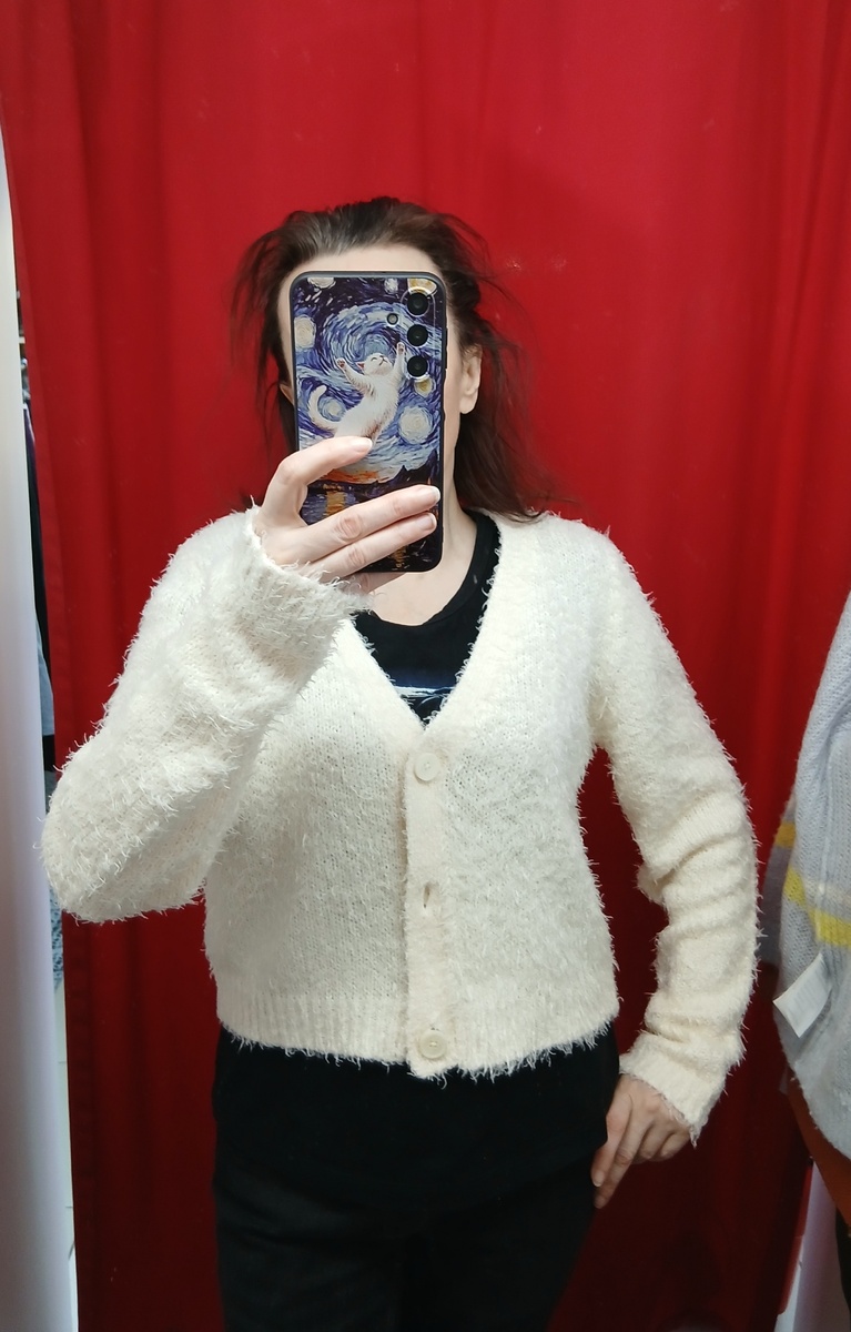 Здравствуйте, я уже привыкла, что если что-то пишут, то это к чему-нибудь точно. Недавно прочитала, что мышки, которые едят от пуза и в свое удовольствие, живут несколько меньше, чем мышки ведущие полуголодное сосуществование. Это к чему? Кушать стало очень вредно? Хотеть бы узнать мнение самих участников эксперимента. Но мнения мышек у нас никого не интересует. Так что не нравятся мне эти эксперименты, а то что у нас почти одинаковый геном, заставляет немного напрячься((. У меня есть старое "Домоводство", ещё бабушкино, так там рецепт пельменей рассчитан примерно на небольшой тазик, наваристые супы, а если запечь окорок, то его хватит на небольшую армию. А сейчас намекают на длинную, но точно несчастную жизнь впроголодь((. Обзор из секонда, цена 590 за кг. Короткий пушистый кардиган. Размер большой, но на мою S подходит, кроме длины рукавов. Кардиган без застежки очень тоненький и лёгкий, просто невесомый. Чуть мохера имеется или по нынешней жизни не чуть, а целых 15%.. Если на фотке