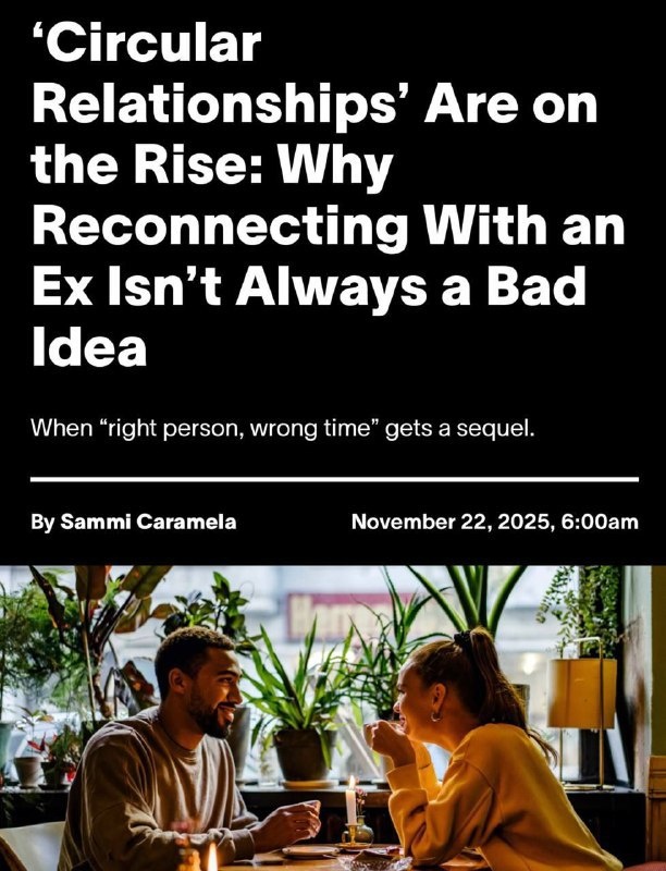 Психологи начали рекомендовать возобновление отношений с бывшими партнерами ради создания более «тёплых» связей. Этот новый тренд на «цикличные» отношения основан на том, что вас уже неплохо знают, а время разлуки позволяет обоим понять свои ошибки. После «воссоединения» не придется заново знакомиться, и расставание придаст отношениям большую ценность. Постмейкер - автоматическое ведение канала 🤖 Анимация | СhatGPT-4 | Помощь с резюме