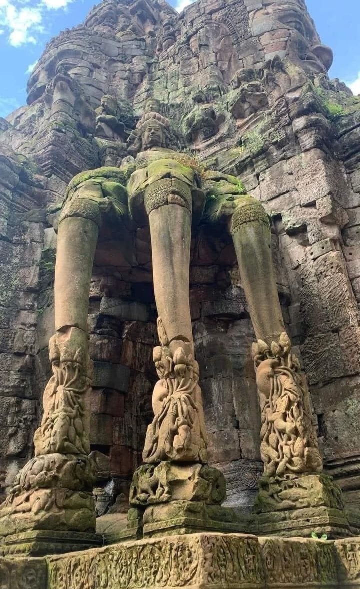Ангкор Том — это город‑космос, вырезанный из песчаника и времени. У него пять величественных входов: по одному с севера, юга и запада, и два — с востока. Именно восточная сторона хранит два из самых драматичных порталов — Врата Смерти и Ворота Победы. Они стоят рядом, как две сцены одного древнего спектакля: одна — для прощаний, другая — для торжеств. Восточные — Врата Смерти. Их называют так не ради мрачности, а потому, что по ним шли похоронные процессии, тащившие мраморную тишину из города в мир иной. Масштабный декор здесь не ради красоты: массивные каменные лица, улыбающиеся в четыре стороны, словно наблюдают за ходом света и смерти одновременно. По обеим сторонам когда‑то тянулись каменные мосты, где плечом к плечу стояли асуры и дэвы — их силуэты ещё можно угадывать в обломках. И под ногами — оригинальное мощение из песчаника с глубокими колеями колесниц: следы движения, оставленные тысячами шагов, как отпечатки чьей‑то долгой памяти. К северу от них — Ворота Победы. Они выстрое