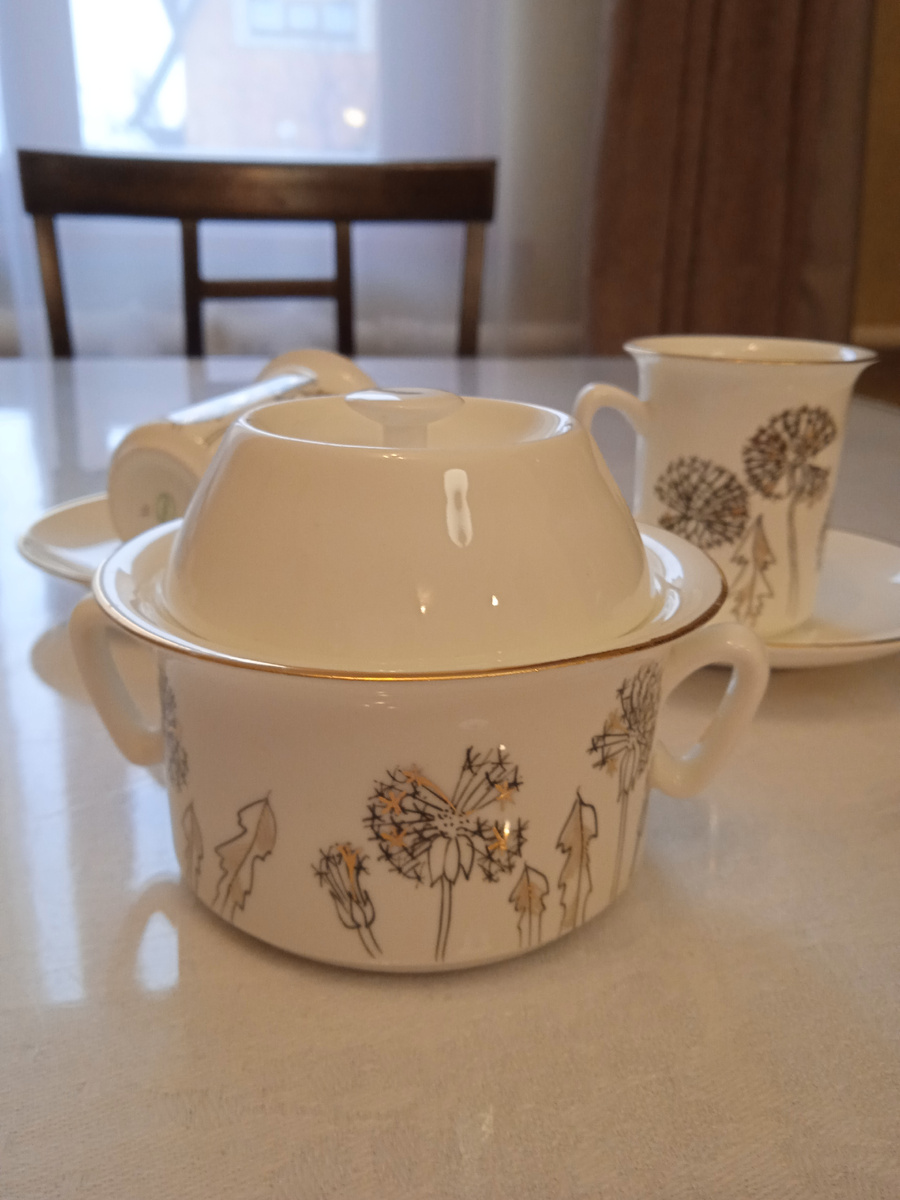 Казалось бы давно я уже на Авито, многие предметы советского фарфора узнаю без клейма, но постоянно нахожу и открываю для себя что-то новое и удивительное. Встретила объявление с чем-то не опознанным, кофейный сервиз. Продавец так и написал, не знаю кто производитель, фото клейма смазанное, ничего не понятно. Хотела пройти мимо, но вернулась. Как то подозрительно благородно блестел молочный фарфор, несмотря на плохое качество фотографий. А рисунок... Такой, какие я люблю😅. Представляю Вам своё новое сокровище: предметы кофейного сервиза Каунасского фарфорового завода JIESIA , Завод основан в Литве в 1938 году и являлся единственным сертифицированным производителем костяного фарфора в странах Балтии. В 70-х годах производство костяного фарфора было возобновлено. И думаю в эти годы был произведён этот кофейный сервиз. Вот так выглядит полный сервиз: Фото с Авито. Цены разные на фарфор от Каунасского ФЗ от 10 до 20 тысяч, смотрела на Мешке и Авито. И сервизы разные, костяной фарф