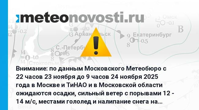 Внимание: по данным Московского Метеобюро c 22 часов 23 ноября до 9 часов 24 ноября 2025 года в Москве и ТиНАО и в Московской области ожидаются осадки, сильный ветер с порывами 12 - 14 м/с, местами гололед и налипание снега на проводах и деревях. Перейти на сайт Прогноз погоды на 14 дней