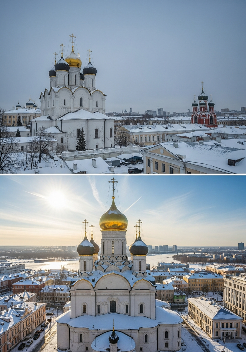 Сердце древнего Пскова, возвышающееся над слиянием двух рек. Зимой белоснежные стены крепости и золотой купол собора создают сказочную картину на фоне заснеженных берегов.