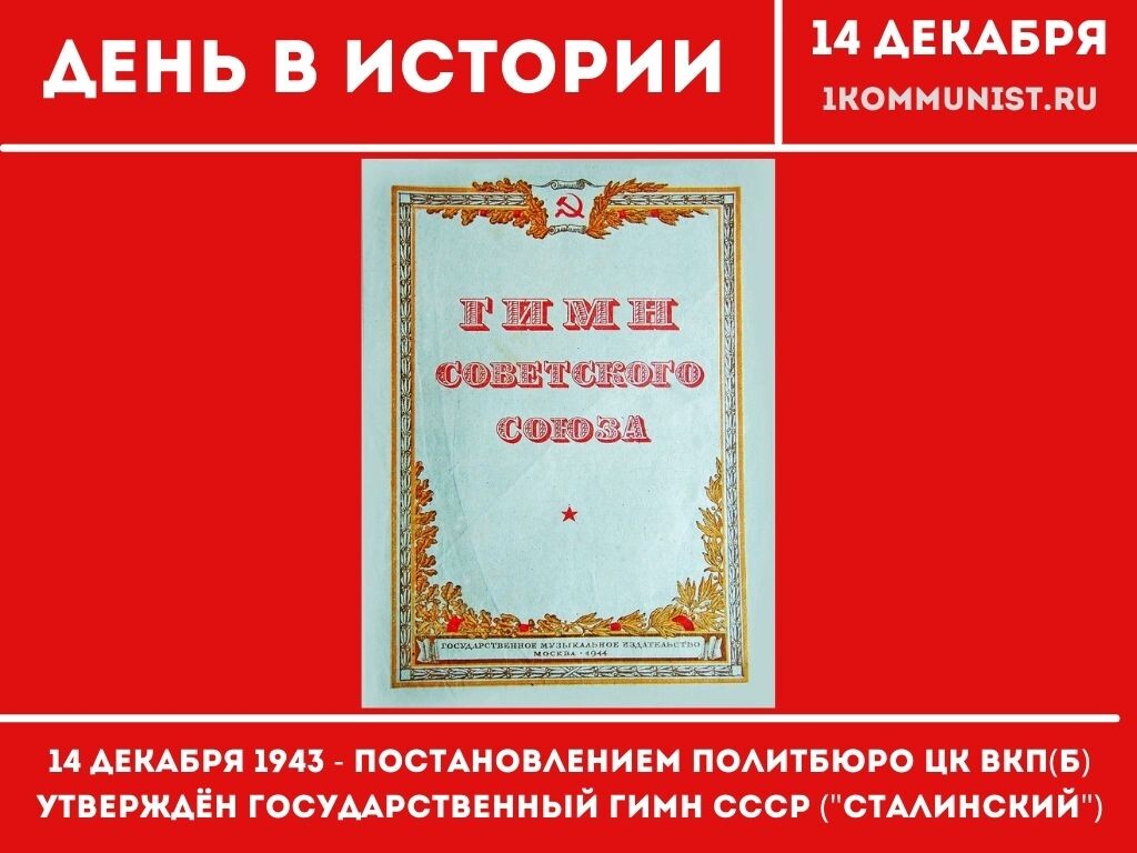 14 декабря 1943 - Постановлением Политбюро ЦК ВКП(б) утверждён Государственный гимн СССР ("Сталинский")
