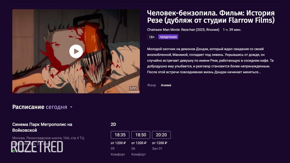 «Человек-бензопила: История Резе» начали предпоказывать в кинотеатрах Правда, буквально несколько дней, включая сегодняшний. Где-то предпоказ ведётся с озвучкой от Flarrow Films, где-то можно посмотреть в оригинале, но с русскими субтитрами. Полноценный показ стартует с 4 декабря. 💼 Rozetked | Подписаться