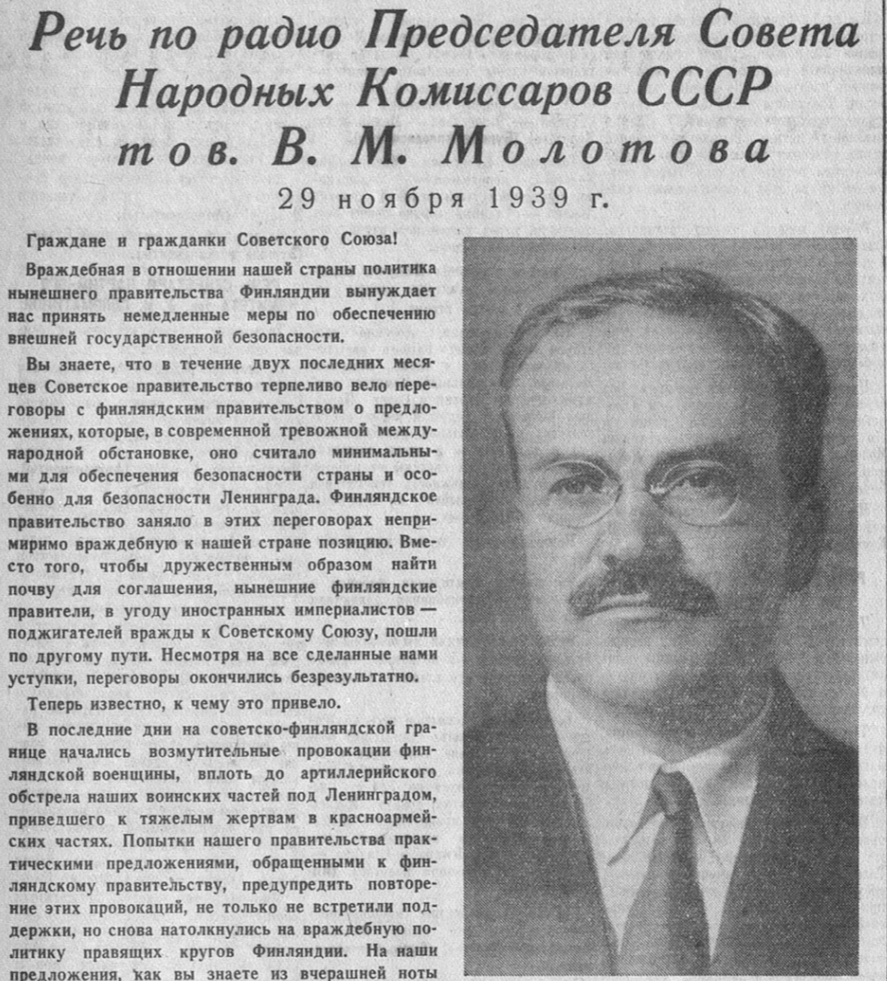 «Газеты – консервы времени» (Карл Краус) 30.11.1939 – Известия Советский Союз готовился к грядущей войне, в которой Финляндия была потенциальным противником. Большую проблемой становилась близость финской границы к Ленинграду, крупному промышленному, экономическому и политическому городу страны. Советские власти попробовали обменяться с финнами территорией, причем готовы были отдать больше земли, чем приобретали взамен, но получили отказ. 30 ноября началось вторжение в Финляндию. Кровопролитная война закончилась заключением мирного договора в Москве 12 марта 1940 года. Финляндия потеряла 10% территории, границы отодвинулись от Ленинграда с 30 до 150 километров. Конфликт выявил недостатки Красной армии, существует мнение, что высокие потери и ошибки в управлении советскими войсками окончательно убедили Гитлера в необходимости нападения на СССР и в том, что вермахт быстро и без особого труда победит. 1929, ноябрь – Крокодил 1966, ноябрь – Крокодил 1969, ноябрь – Крокодил 1972, ноябрь – К