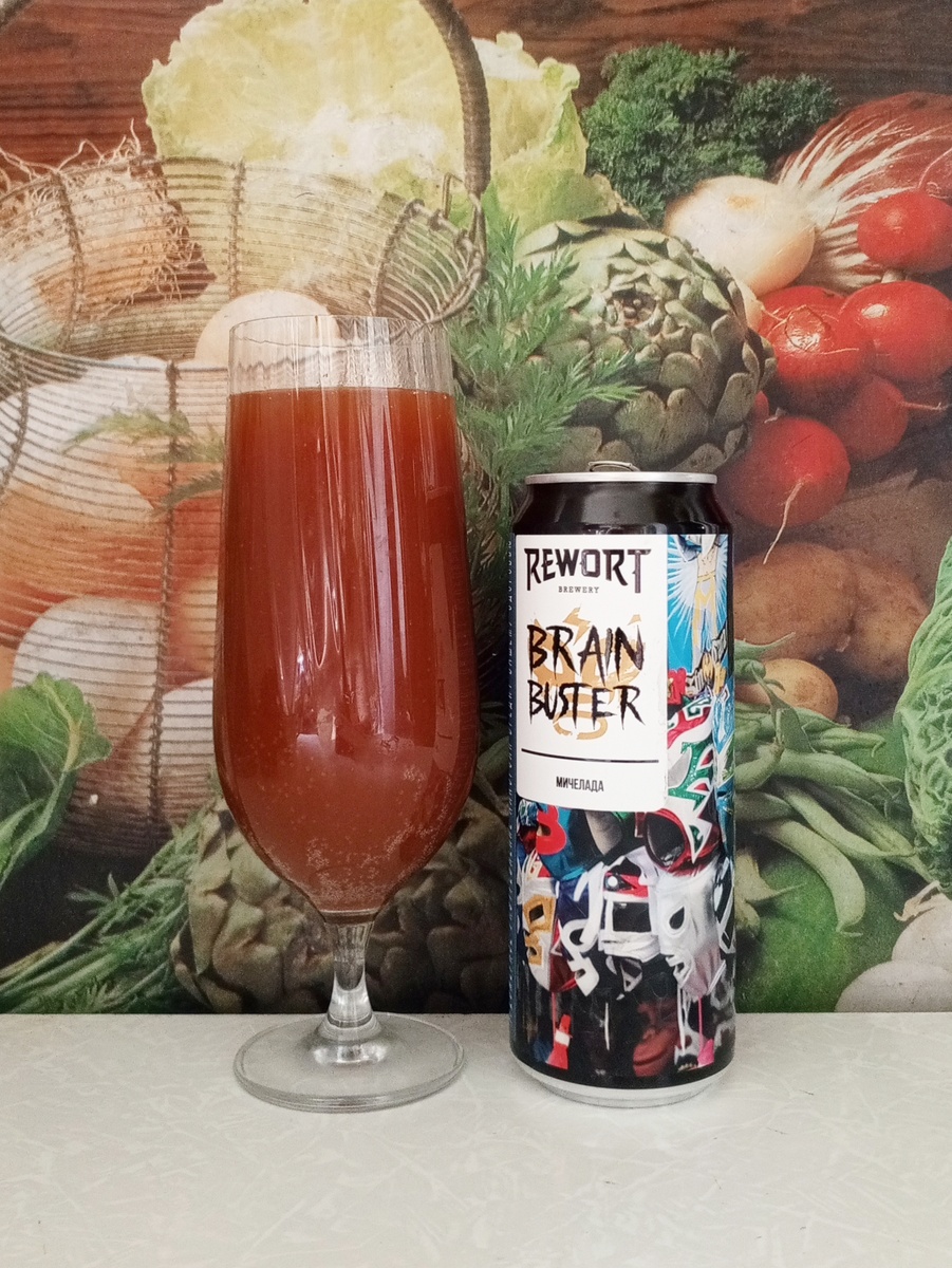 Дошли руки написать ещё про один сорт от Rewort Brewery из числа тех, что сейчас продают в "Перекрёстке". Как раз для тех, кто тоже в томатной теме как и я. "Brain Buster" Наша версия классического мексиканского коктейля "Мичелада": база из лагера, томатные пюре и паста, копчёная паприка, перец, уксус и соевый соус. Пивной напиток непастеризованный нефильтрованный осветлённый "БРЕЙН БАСТЕР". Состав: вода подготовленная, солод пивоваренный ячменный светлый, томатная паста, томатное пюре, концентрированный сок лимона, концентрированный сок апельсина, соевый соус, уксус, паприка, соль, чёрный перец, хмелепродукты, дрожжи пивные, консерванты (Е224, Е211). Стиль: Мичелада Объем: 0,45 л. Изготовитель: ООО "Свои" (Московская обл., г. Сергиев Посад) Цена: 219 рубля 99 копейки Дата розлива: 28.03.2025 Пивной напиток в стиле известной на весь мир мичелады, любителей которой немало у нас в стране. Тёмно-красного цвета. Без пены. Приятно пахнет помидорками и различными пряностями. Совсем не густой