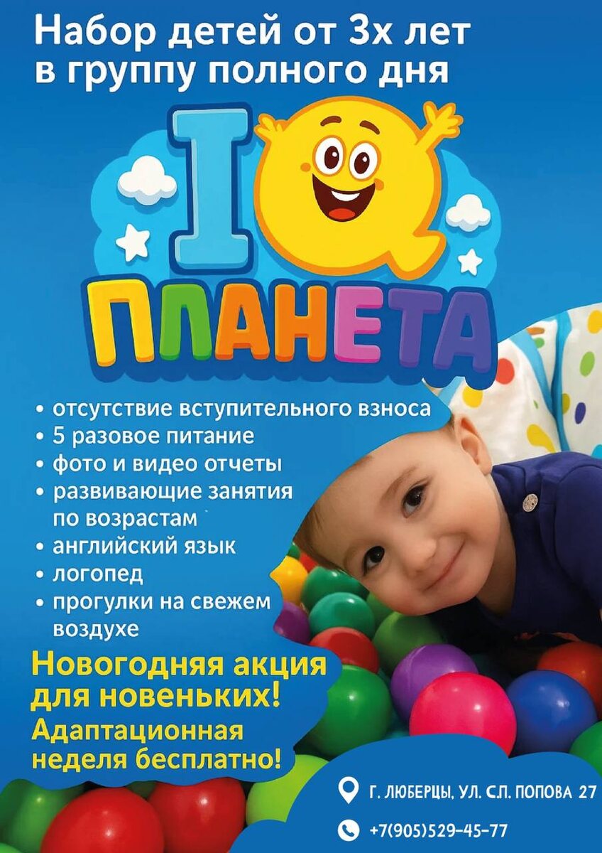 Частный детский садик «IQ ПЛАНЕТА» 🌈ведет набор детей от 1,1 до 7 лет. В нашем детском саду реализуется сильная обучающая программа, включая английский и математику, обучение грамоте, развитие творчества и занятия направленные на развитие памяти, логического и невербального мышления. А также: ✅разновозрастные группы ✅фото и видеоотчеты, камеры видеонаблюдения и пультовая охрана ✅сбалансированное 5-ти разовое питание с учетом особенностей деток ✅развивающие занятия в соответствии с лучшими классическими и современными практиками ✅кол-во детей в группе до 15 человек ✅ Занятия по английскому языку ✅ Прогулки на свежем воздухе на огороженной площадке ❇️ логопед-дефектолог, логопедическая ритмика и нейропсихолог Ждём Вас с 8:00 до 20:00 с понедельника по пятницу. 📍Наш адрес: г. Люберцы, ул. С П Попова, д. 27 89055294577 www.iqplaneta.com.ru