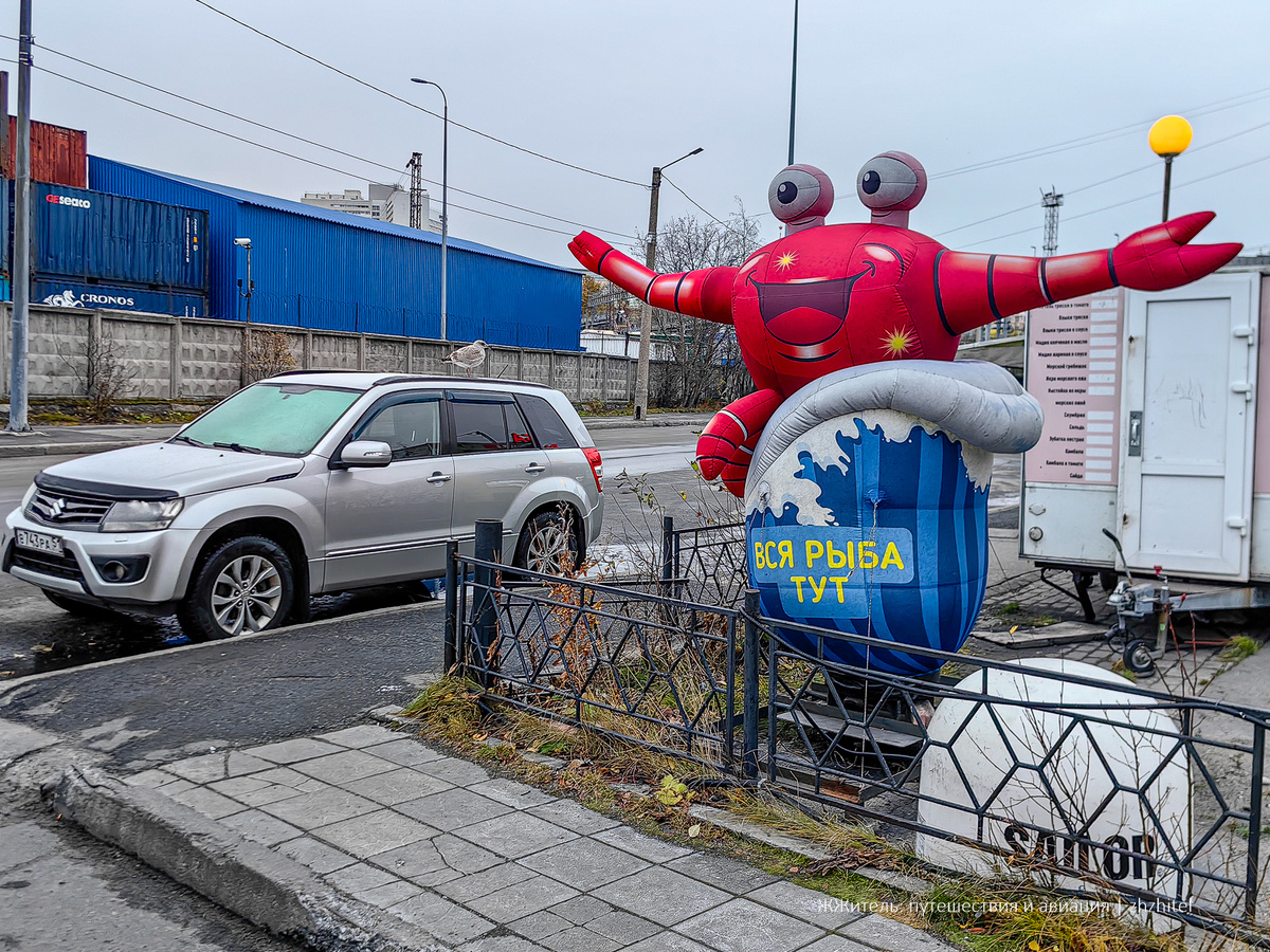 Надувной краб призывно махал клешнями и говорил: «Рыба тут!» Мы спешили увидеть атомный ледокол «Ленин», поэтому решили заглянуть в магазин на обратном пути. В центре магазина был пустой бассейн со спасательным плотом и манекенами водолазов. Тут же был манекен в фуражке. Прилавки с рыбой занимали от силы пятую часть зала. Нам сказали, что продукция местная, рыбу коптят сами. Давайте посмотрим, что тут предлагают.