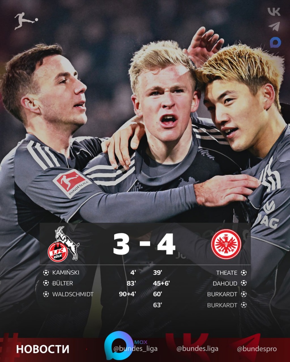#Бундеслига ⚽️ 11 тур. «Кёльн» - «Айнтрахт» 3:4 ⚽️ 1:0 Каминьский – 4' ⚽️ 1:1 Теате – 39' ⚽️ 1:2 Дауд – 45+6' ⚽️ 1:3 Буркардт – 59' ⚽️ 1:4 Буркардт – 63' ⚽️ 2:4 Бюльтер – 83' ⚽️ 3:4 Вальдшмидт – 90+4' После этой игры «Кёльн» с 14 очками располагается на девятой строчке в турнирной таблице высшего дивизиона первенства Германии, «Айнтрахт» с 20 очками находится на шестом месте. В следующем туре красно-белые 29 ноября сыграют в гостях с «Вердером», «орлы» 30 ноября примут на своём поле «Вольфсбург». ⭐️ MAX -❤ Телеграм - ✅️Вконтакте