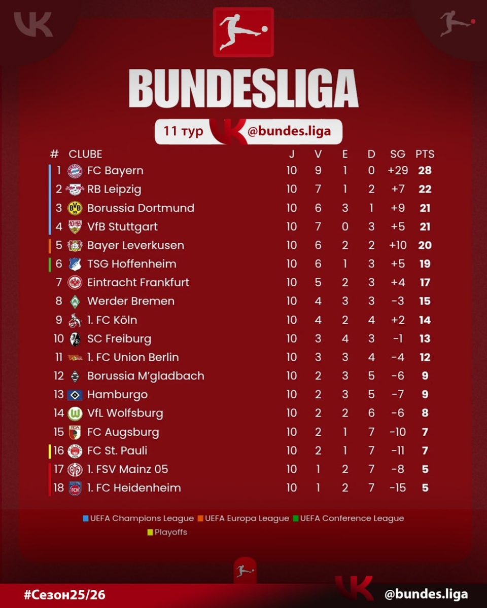 #Бундеслига ⚽️ Итоговая таблица Бундеслиги после 11 туров 📝 Результаты всех матчей.