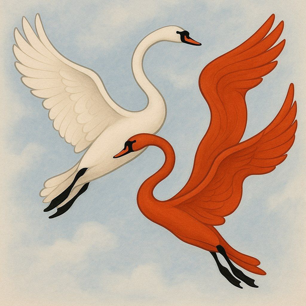 Во чистом поле березка клонилась, Под той березкою речка струилась. Подкралась к речке девица в срок, Уронила в воду алый цветок. А из глубины в ответ распустился белый цвет. И стоит как живой, образ водный, безликий Кувшинка в руках, а в очах холод дикий. «Я— твоя радость на утренней зорьке мечта, А ты— моя грусть до самого дна, сестра». Взмолилась девица: «Верни мне мой свет!» А из вод голосок:«в тепле света нет». Тронул ветер цветы— и их забрала вода, А на месте том птицы возникли— два восточных крыла Одна — белым крылом, как тот цветок ледяной, Другая— красным, как зари полыханье весной. Летят сквозь туманы, сквозь грозы, сквозь ночь и восход — Красный лебедь и белый, их ветер лаская ведёт. Не бывать им врозь до скончания дней— Два крыла у судьбы, всегда из света теней.