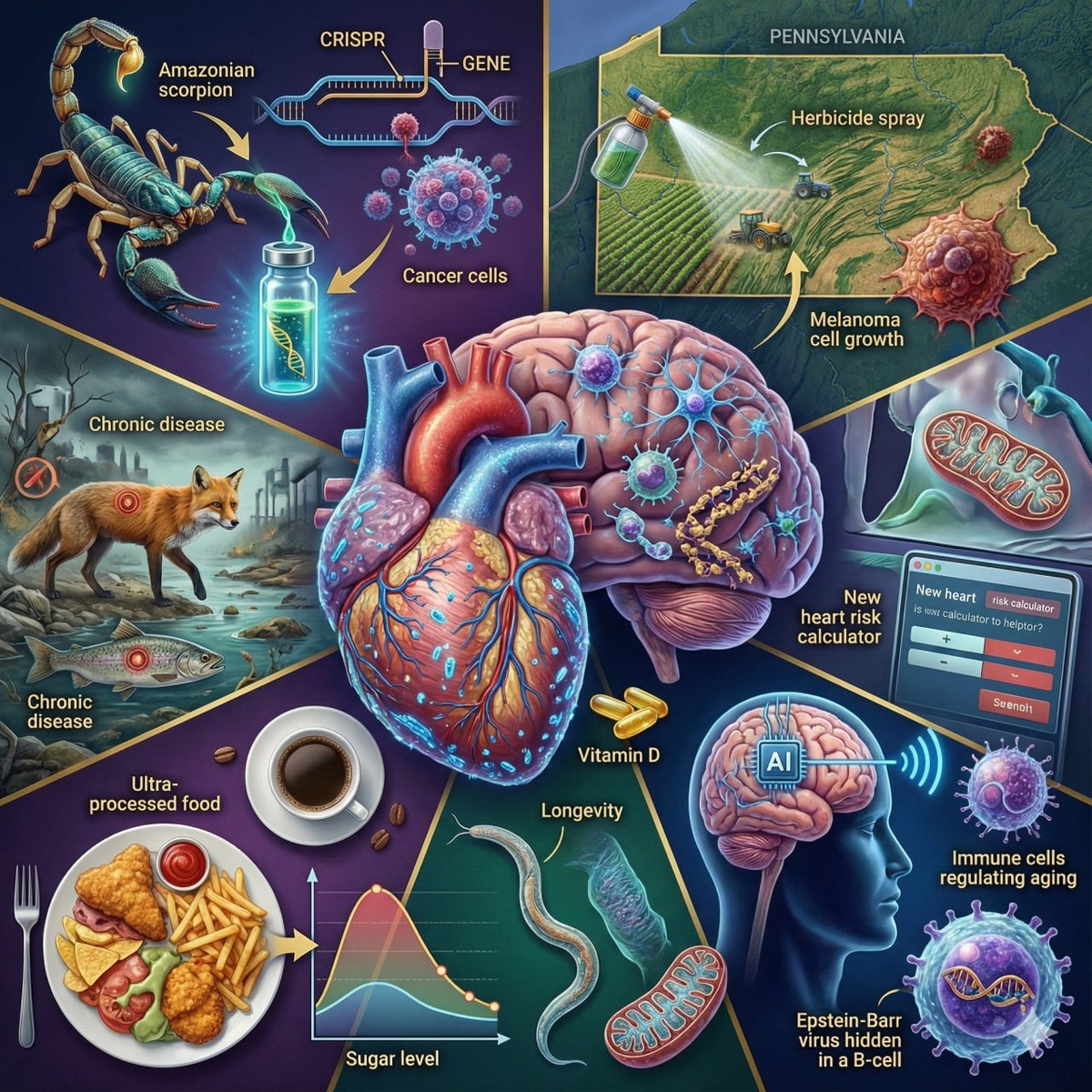 ‼️‼️‼️ Топ-новостей о здоровье за прошедшую неделю ▪️ Микропластик в быту может напрямую ускорять развитие болезней сердца и закупорку артерий ▪️ Яд амазонского скорпиона показал эффективность против рака груди, сравнимую с химиотерапией ▪️ У диких и домашних животных растет уровень «человеческих» хронических болезней (рак, диабет). Причина - экология. ▪️ В Пенсильвании выявлен резкий скачок заболеваемости меланомой в районах с активным использованием гербицидов ▪️ Ультраобработанные продукты вызывают предиабет у молодежи быстрее, чем считалось ранее ▪️ Обнаружен механизм, при котором тау-белки (причина Альцгеймера) сначала образуют обратимые кластеры, что дает шанс на лечение ▪️ Технология CRISPR помогла «включить» древний ген для защиты от подагры и ожирения печени ▪️ Разработан новый генетический тест, предсказывающий риск опасной аритмии задолго до симптомов ▪️ Иммунные клетки в оболочках мозга могут скрыто управлять уровнем тревожности ▪️ Хроническая боль может значительно повыша