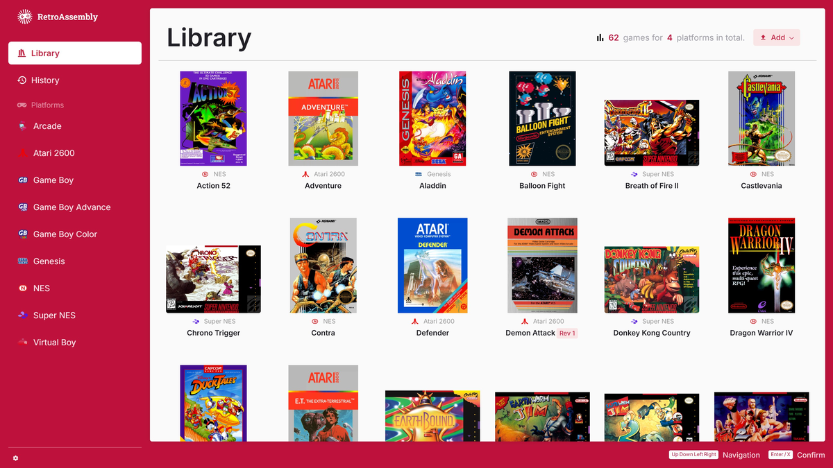 RetroAssembly — это бесплатная онлайн-платформа с открытым исходным кодом, предназначенная для организации и запуска вашей личной коллекции классических консольных игр прямо в веб-браузере. Сервис позволяет загрузить ROM-файлы один раз и получать доступ к ним, а также к сохраненному прогрессу, с любого устройства, что делает его удобным аналогом медиа-сервера для ретро-игр. Основные возможности * Поддержка множества платформ: Включает эмуляцию игр для NES, SNES, Genesis, GameBoy, Arcade и других классических консолей, основываясь на библиотеках RetroArch. * Автоматическое оформление: Сервис автоматически определяет игры и отображает красивое оформление коробок и обложек для вашей коллекции. * Синхронизация прогресса: Сохраняет и синхронизирует игровой прогресс (состояния сохранений) между устройствами, позволяя возобновить игру в любое время и на любом устройстве. * Функция перемотки: Некоторые эмуляторы поддерживают возможность перемотки геймплея для исправления ошибок или повторного