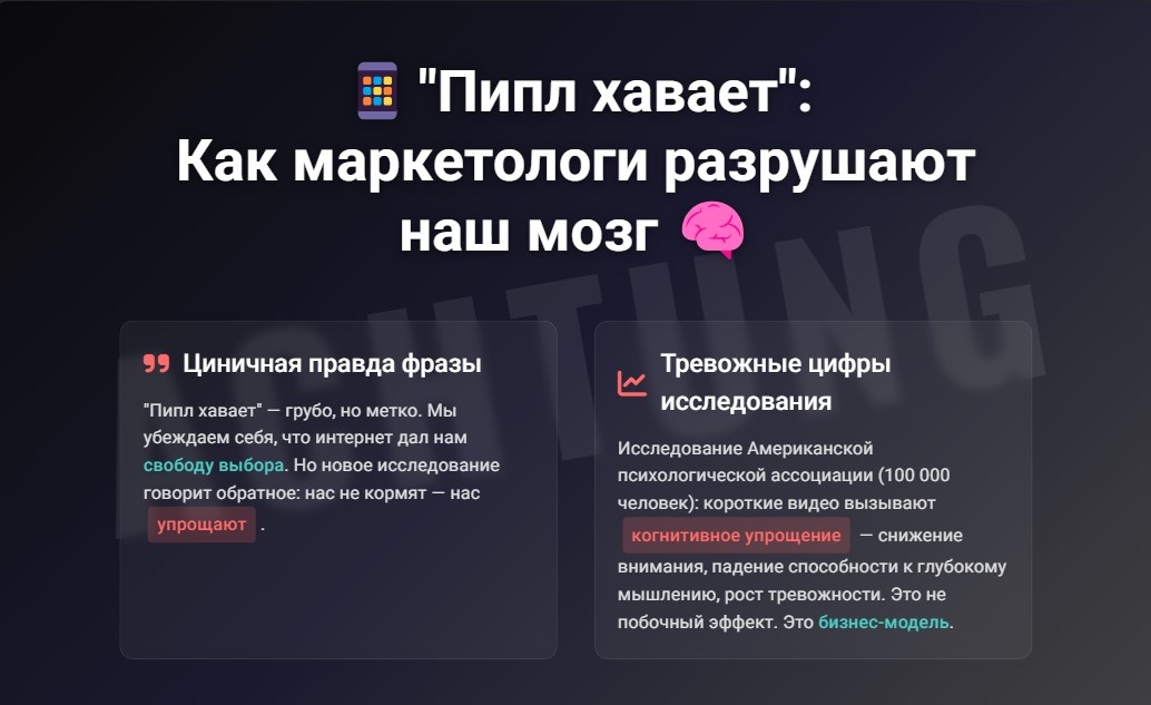 Исследователи из Американской психологической ассоциации, собрав данные почти 100 000 человек, пришли к тревожному выводу: короткие видео (TikTok, Reels, Shorts) вызывают то, что в профессиональной среде теперь называют "когнитивное упрощение" - снижение внимания, падение способности к глубокому мышлению, рост тревожности. Это не побочный эффект. Это бизнес-модель.