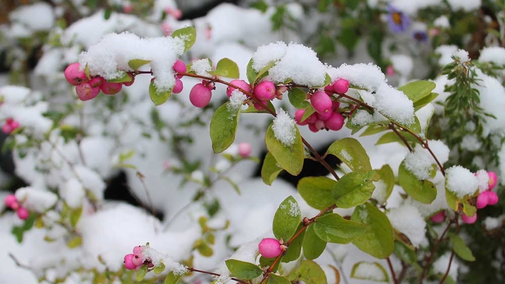 Красные ягоды лимонника, алеющие гроздья рябины, белые, а особенно розовые «жемчужины» снежноягодника притягивают к себе восхищенные взгляды.