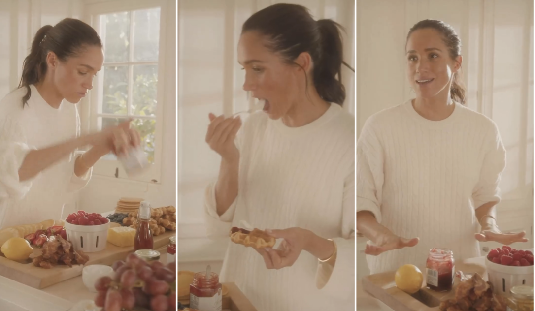 Герцогиня Сассекская вновь учит всех, кто не успел увернуться, тому, как быть гостеприимной хозяюшкой! На сей раз тема видеолекции - приготовление завтрака для гостей. Подайте его так, как это делают в отеле за шведским столом: всё, что есть в печи, всё на стол мечи, и оставь там, ведь гости просыпаются в разное время. А дальше гости уже сами: джема зачерпнут, йогурта сверху положат, ягод... И почувствуют, как вы о них позаботились! "Я люблю, когда ягоды порезаны на половинки", - вещает Меган Маркл в ролике, вываливая на доску совершенно целые ягоды и поливая "йогуртовое парфэ" медом от собственного бренда, подозрительно смахивающим на сахарный сироп. Ну правильно, не для себя любимой завтрак, для гостей. Им и целые ягоды сгодятся. Намазывая взбитыми сливками и джемом вафли, не забудьте облизнуть ложку! Это важно, без этого вы, как хозяйка, можно сказать не состоялись. Гостям будет приятно пользоваться помеченной вами ложкой! А вообще, объясняет герцогиня Сассекская, если у вас собра