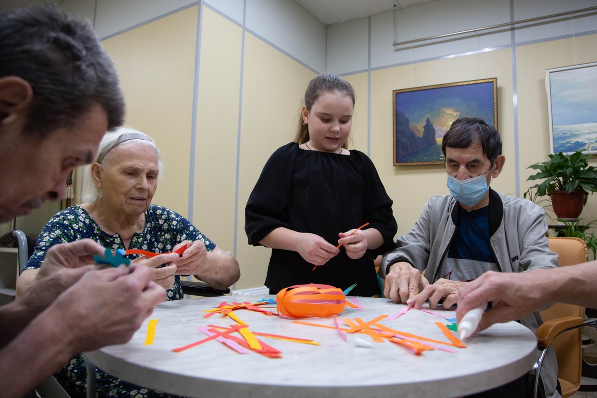 За столиком четыре пациента — кто-то пришел сам, кого-то привезли в коляске. Валя выдает бумажные заготовки для осенней аппликации, клей. Объясняет: берем желудь и листик, прижимаем руками, чтобы приклеить. «У кого крепче приклеится — тому приз, да?», — шутит один из пациентов, Сергей. Потом делают бумажный фонарик в форме тыквы.