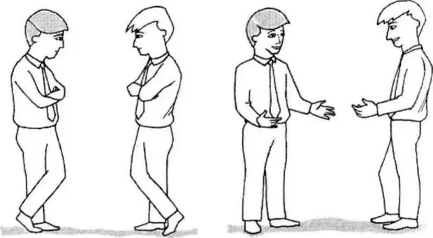 - Открытые жесты (раскрытые ладони, расправленные плечи) обычно сигнализируют о дружелюбии, искренности и готовности к общению.