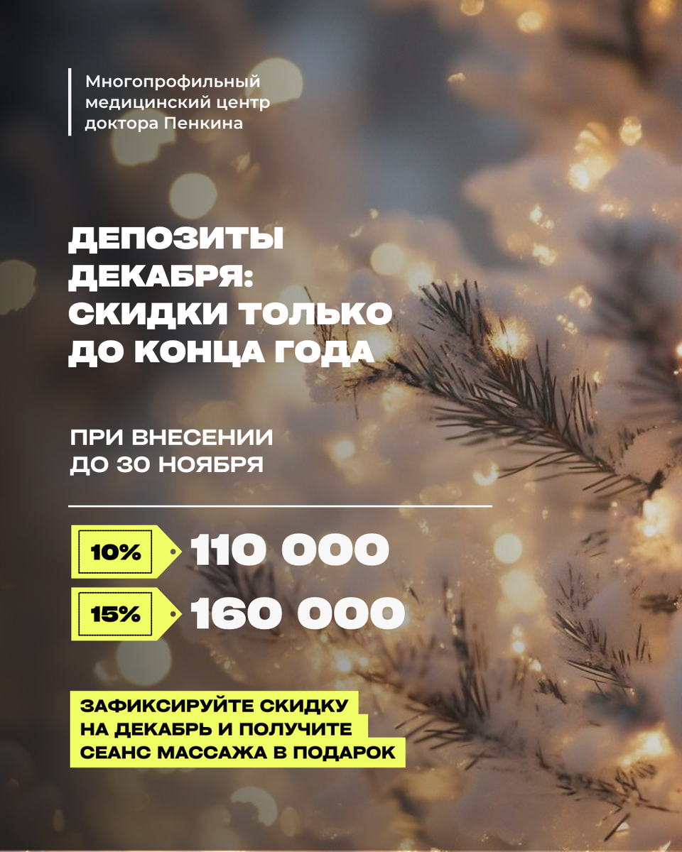 💎 Бесплатный сеанс массажа 110 000 рублей → скидка 10% 160 000 рублей → скидка 15% Мы помогаем провести все необходимые обследования, избавиться от боли, устранить риск патологий и восстановить ресурсы организма для гармоничного вступления в новый год жизни🩵 📌 Депозит не сгорает — средства остаются на вашем счёте и могут быть использованы на любые услуги центра 📞 Запись на консультацию: +7 (966) 100-03-00