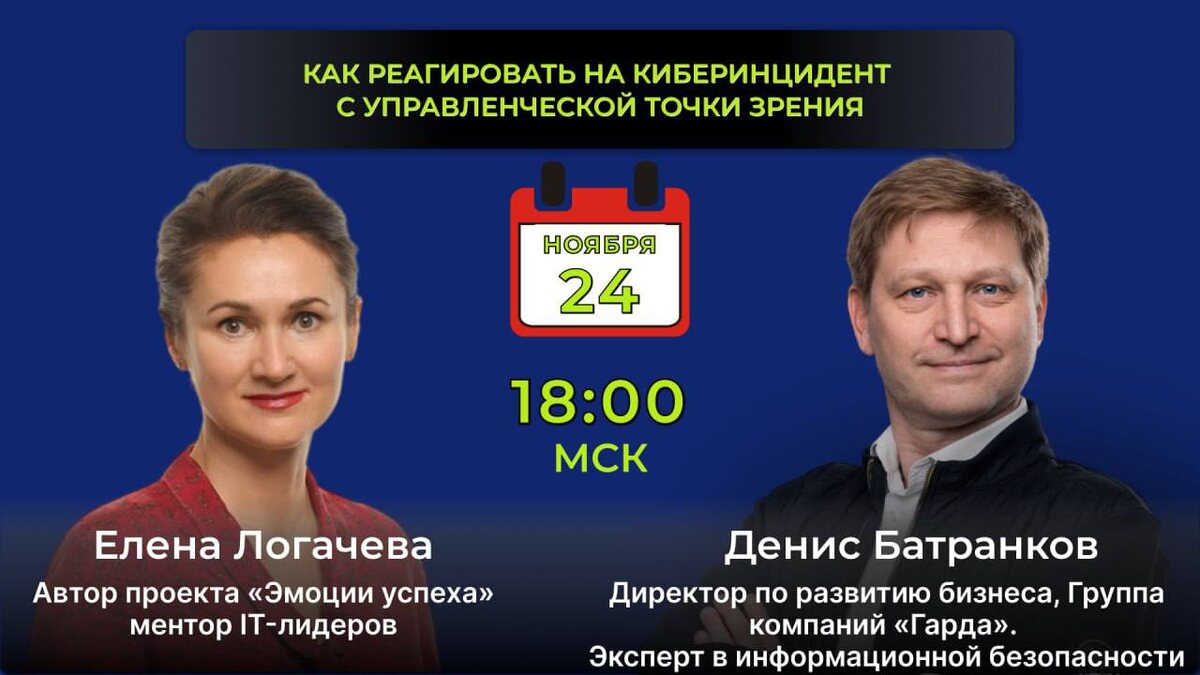 😂👍👍❤👌😅😊😊😍😘 24 ноября, в 18:00 ч. Когда происходит потеря данных, кибератака или другая кризисная ситуация в ИТ, очень сложно оставаться спокойным, согласитесь? ТЕМА ЭФИРА: «Как реагировать на киберинцидент с управленческой точки зрения?» Да, я видел разные ситуации. Мы собрались обсудить как сохранять трезвый взгляд, личное спокойствие и команду в моменты кризиса. Обсудимс Еленой Логачевой: ❓ что на самом деле происходит с людьми во время киберинцидента? ❓ какие шаги лидер может предпринять, чтобы снизить хаос, сохранить доверие, удержать рабочий фокус и минимизировать человеческие ошибки в кризисе? Разберем подробно: 📌 почему даже опытные команды теряются при киберинциденте? 📌 можно ли подготовить команду к киберинциденту не только технически, но и эмоционально? 📌 где проходит грань между прозрачностью и паникой: сколько информации стоит давать команде и клиентам? Елена Логачева - эксперт по развитию эмоционального интеллекта для IT руководителей РЕГИСТРАЦИЯ Обязат