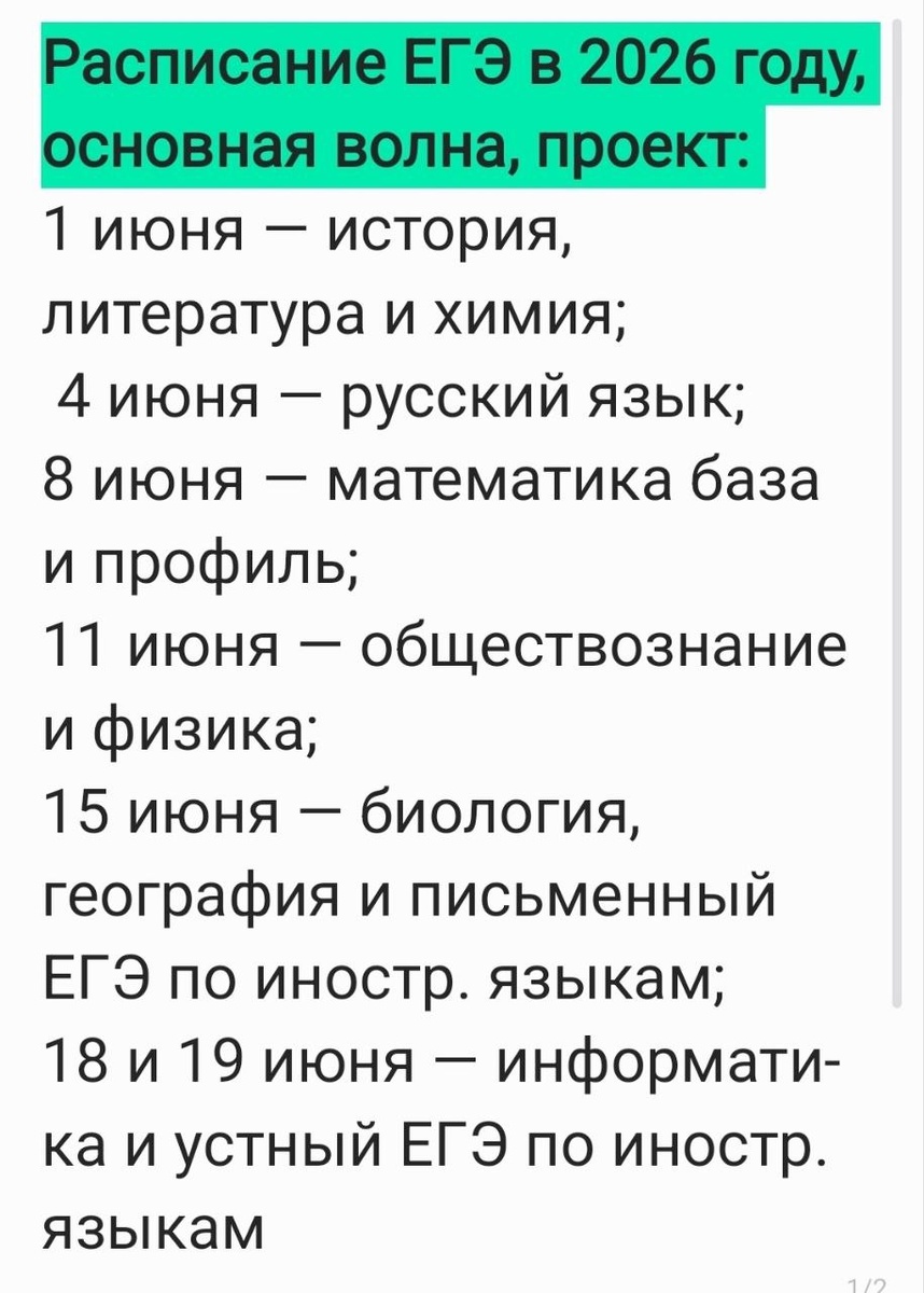 Проект приказа Минпросвещения России и Рособрнадзора «Об утверждении единого расписания и продолжительности проведения единого государственного экзамена». Досрочный период 20 марта (пятница) — география, литература; 24 марта (вторник) — русский язык; 27 марта (пятница) — ЕГЭ по математике базового уровня, ЕГЭ по математике профильного уровня; 31 марта (вторник) — биология, иностранные языки (английский, испанский, китайский, немецкий, французский) (письменная часть), физика; 3 апреля (пятница) — иностранные языки (английский, испанский, китайский, немецкий, французский) (устная часть); 7 апреля (вторник) — информатика, обществознание; 10 апреля (пятница) — история, химия. Резервные дни 13 апреля (понедельник) — русский язык; 16 апреля (четверг) — ЕГЭ по математике базового уровня, ЕГЭ по математике профильного уровня; 17 апреля (пятница) — биология, иностранные языки (английский, испанский, китайский, немецкий, французский) (письменная часть), литература, обществознание, физика; 20