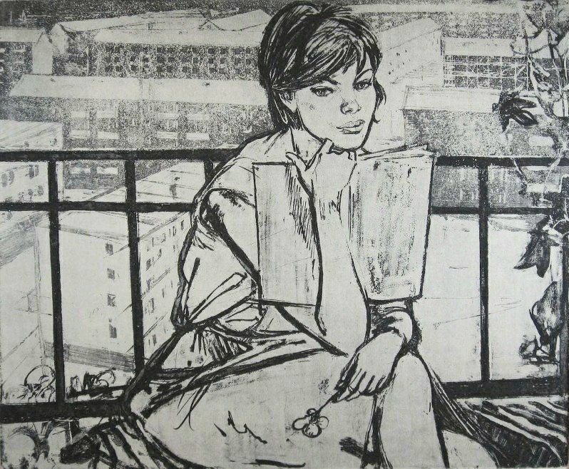 Петров Леонид Григорьевич (1919-1978, Ленинград) Петрова Валентина Владимировна (1922 -2018, Петербург) Студентка.1964 . Бумага, офорт.49 х 59. Музей- заповедник "Шушенское".