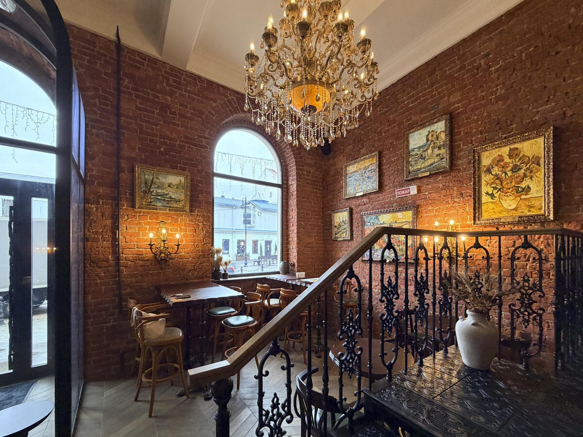 Шучу, из ушей у них только номерки в гардеробе, который переходит в бар. И снова очередное проклятое помещение на Комсомольской было усыновлено неизвестными энтузиастами. Через аллею от «Драничной номер один» кто-то идейный и явно богатый открыл гастробар в честь нидерландского живописца Винсента Ван Гоги, с картинами, канделябрами, хрустальными люстрами, свисающими с потолка, и вторым ярусом для тихих винопитий. Внутри, как художественная едальня-галерея блюд «Моне Мане», но без издевательств над продуктами. В меню всё понятно без слов, аллилуйя! Жизнь в красном кирпиче под высокими потолками, с окнами на всю стену и хрустальными люстрами, в отражении которых мелькают бутылки шампанского. Красиво, но как-то по-пенсионерски всё. Из металла надстроили второй ярус, чтобы вместить ещё больше денег. МИНУСЫ: нет барной стойки, кофе и коктейли готовят в гардеробе. Некомфортные столы, напоминающие о районной пивнушке. Готовят понятную еду из клубней, круп, мяса птиц, рыб и животных. Цены выс