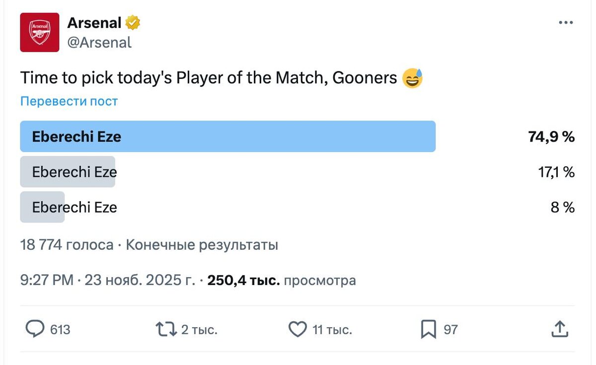 "Арсенал" предлагает своим фанатам проголосовать за лучшего игрока матча 😅