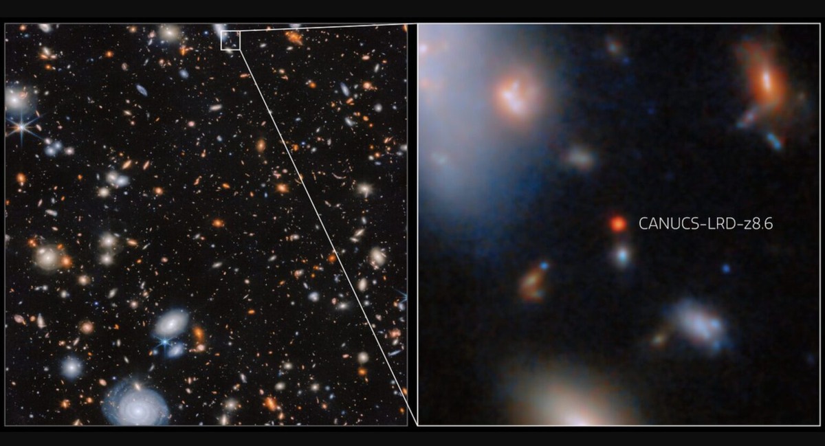 Международная команда исследователей, возглавляемая Робертой Триподи из Университета Любляны, провела наблюдения за галактикой CANUCS-LRD-z8.6, расположенной на огромном расстоянии от Земли. Свет от этого объекта преодолел 13,3 миллиарда световых лет, чтобы достичь современных телескопов. Галактика относится к эпохе реионизации — периоду, когда Вселенная только начинала формировать первые звезды и галактики. В центре CANUCS-LRD-z8.6 ученые обнаружили сверхмассивную черную дыру, масса которой превышает 100 миллионов солнечных. Это значение оказалось в десятки раз выше, чем предполагали существующие модели для столь ранних этапов развития космоса. Подобные объекты ранее не встречались в столь молодых и компактных галактиках. CANUCS-LRD-z8.6 по размерам значительно уступает Млечному Пути, однако темпы звездообразования в ней поражают: ежегодно здесь появляется около 50 новых светил, что необычно для столь молодой системы. Спектральные исследования показали, что температура газа внутри гал