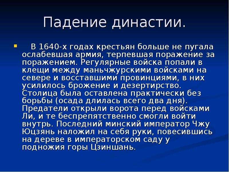"Крестьянская армия 26 апреля 1644 г. победоносно вступила в Пекин. Все десять тысяч евнухов бежали из Запретного города. С императором Юцзянем остался лишь один кастрат. Символично, что вдвоем они и повесились на кривом стволе ясеня, сделав из своих поясов петли. Правящая клика скопцов перебралась в Нанкин - Южную столицу и создала здесь свое правительство во главе с главным евнухом Ма Шиином.