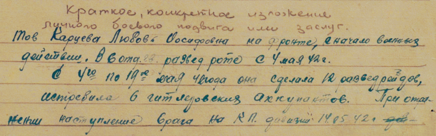 Только 04—19.05.1942 гвардии сержант Любовь Карцева участвовала в 12 разведрейдах и убила из своего автомата 6 гитлеровцев: троих — 12.05.1942 и ещё троих — при отражении атаки фашистов на дивизионный КП 14.05.1942, доведя свой личный счёт до 19 уничтоженных фашистов.