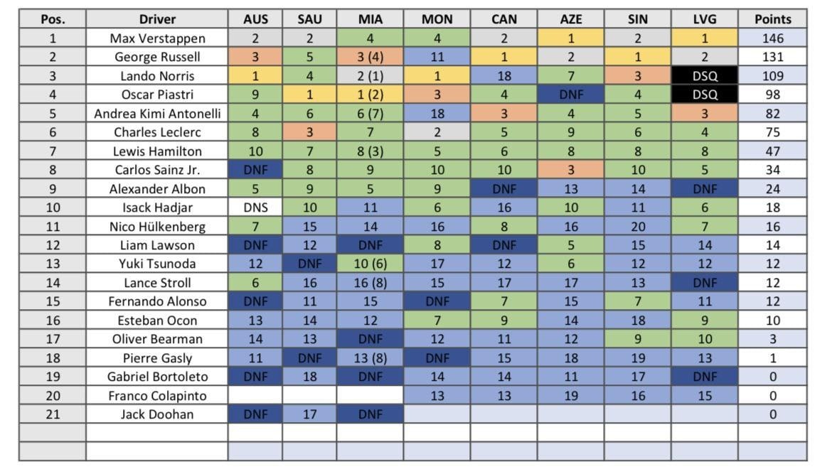 Чемпионат Формулы 1, если бы в календаре были только городские трассы Ферстаппен и Рассел в такой ситуации опережают оба Макларена, а совсем недалеко от Пиастри располагается Антонелли, даже выше Леклера, который обычно городские трассы любит. В средней же группе лучший результат у Карлоса Саинца