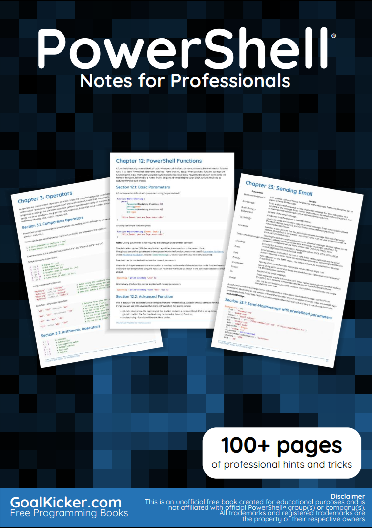Автор: GoalKicker.com Язык: EN Год: 2017 Эта книга создана на основе Документации Stack Overflow, а её содержимое написано замечательными участниками Stack Overflow. Текстовое содержимое распространяется по лицензии Creative Commons BY-SA; список авторов, внесших вклад в различные главы, приведён в конце этой книги. Изображения могут быть защищены авторским правом их соответствующих владельцев, если не указано иное. Это неофициальная бесплатная книга, созданная в образовательных целях, которая не связана с официальными группами или компаниями PowerShell, а также со Stack Overflow. Все торговые марки и зарегистрированные торговые марки являются собственностью их соответствующих правообладателей. Информация, представленная в этой книге, не гарантируется как правильная и точная; используйте её на свой страх и риск. Содержание Getting started with PowerShell Variables in PowerShell Operators Special Operators Basic Set Operations Conditional logic Loops Switch statement Strings HashTables