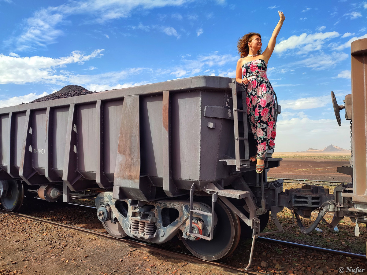 Это самый длинный в мире грузопассажирский поезд, длина состава доходит до 3 километров! Можно ехать в пассажирском вагоне, но он выглядит не очень, уж лучше на железной руде. Жестко и холодно, зато запомнится на всю жизнь. Поезд курсирует от города Зуэрат, где находятся горнодобывающие шахты, в порт Нуадибу. Протяженность маршрута - 704 километра, мы проехали 670 километров. У поезда нет четкого расписания, никто не знает, когда он отправится. Может поехать днем, а может вечером или вообще задержаться на сутки. Мы подъехали около 14:00, погрузились и стали ждать. Было время, чтобы сделать фотографии на память. Йуху, приключение начинается! На самом деле, поезд уже стал аттракционом, туристы из разных стран едут в Мавританию, чтобы прокатиться на нем. Пассажирские вагоны прицеплены в конце, это сделано в целях безопасности. Если поезд сойдет с рельс, пострадают только головные вагоны, остальная часть состава обычно остается целой и невредимой. Даже если едешь на руде, лучше выбирать ва