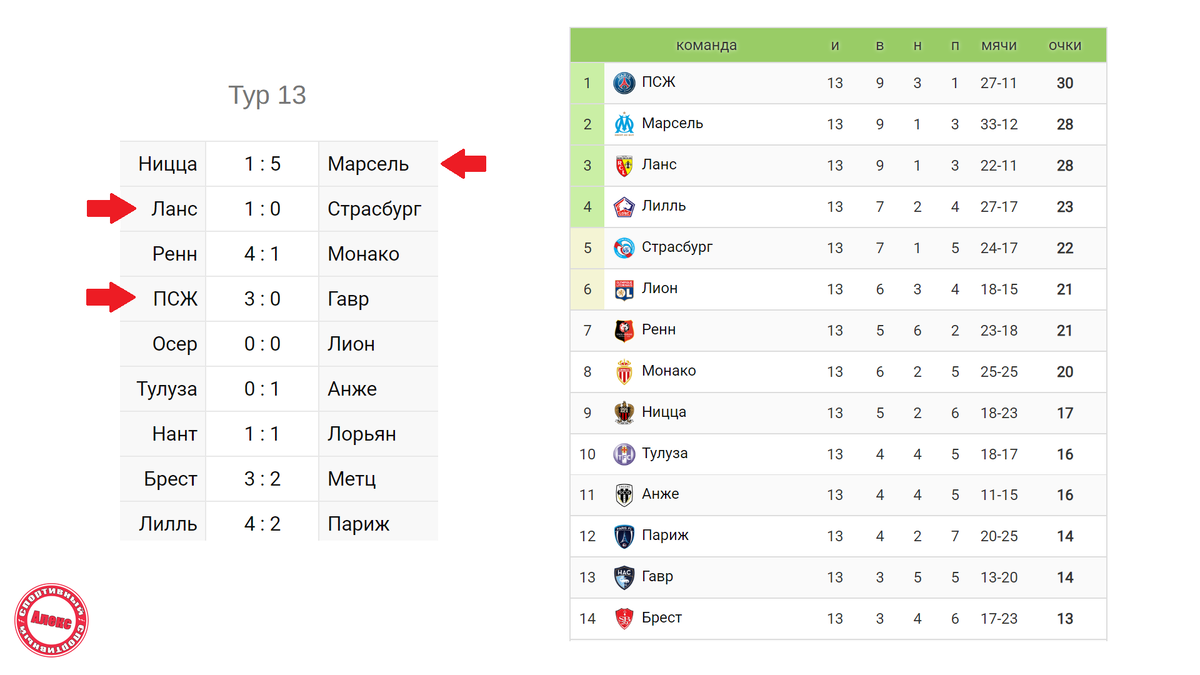 Доброе утро всем. Сегодня расскажу о результатах ТОП-чемпионатов, подведу итоги и покажу положение команд в турнирных таблицах. Буду рад обратной связи, если вы напишите, что вам понравилось, что не понравилось. Начну обзор с французской Лиги 1. ПСЖ одержал уверенную победу над Гавром 3:0. Конкуренты не дремали и тоже победили Марсель – Ниццу 5:1 (Обамеянг отметился тремя результативными действиями), Ланс минимально взял вверх над Страсбургом. Поль Погба после допингового скандала впервые с 2023 года появился на поле. Случилось это на 85-й минуте матча Монако – Ренн. Его Монако победил 4:1. Давайте посмотрим результаты 11 тура Бундеслиги. Лидер Бавария, уступая к 17-й минуте 0:2, выиграла матч у Фрайбурга со счетом 6:2. Олисе сделал 5 результативных действий (2 гола и 3 передачи). Конкурент Лейпциг победил Вердер 2:0, Байер на выезде одолел Вольфсбург 3:1. Заметьте, что 4-я и 5-я команды чемпионата Германии Боруссия и Штутгарт сыграли результативную вничью 3:3. В составе гостей Ундав о