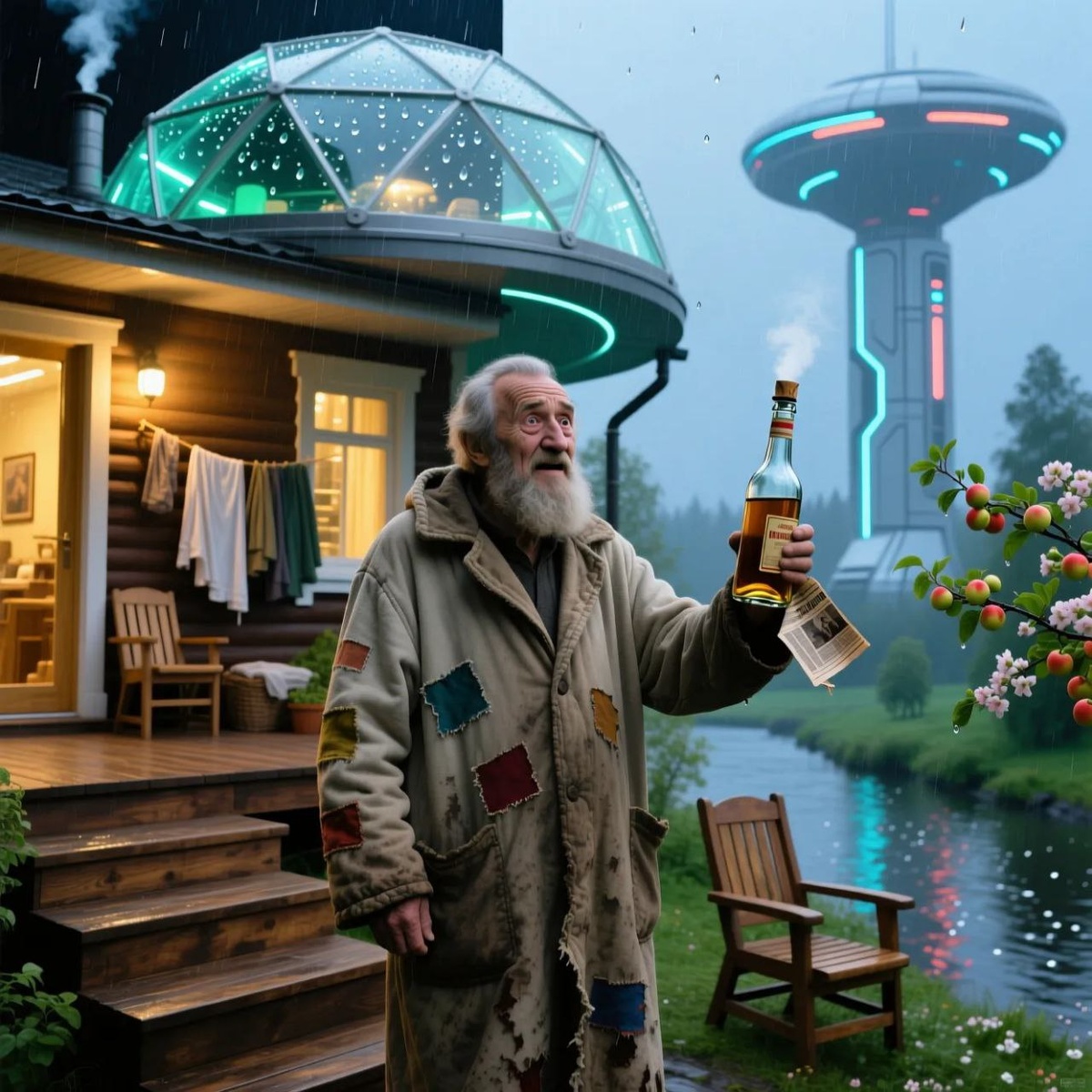 Свист, нарастающий до ультразвука прокатился над крышей дачи, над яблонями прошёл сквозь сосны и расстроился где-то далеко над речкой. Потом произошел резкий щелчок и вспыхнул купол. Не стеклянный, не металлический — прозрачный, как слеза, но неотразимый. Птицы, задев его крылом, отлетали с испуганным чириканьем. Ветер стихал у границы невидимого барьера. Иван Петрович хохотнул, глядя, как волна дождя разбивается о купол, оставляя его мир сухим и теплым. Глава 3. Неожиданная встреча. Годы сплелись в ритуал.Каждое утро неизменно кофе у ручья. Энергетический купол пропускал чистую воду. Днем записи в потрепанном блокноте. Иван Петрович вел свой календарь как Робинзон Крузо на острове. День 468. "Эффект изоляции: +12% при солнечной активности. Парниковый эффект отсутствует". Вечером джазовая музыка на катушечном магнитофоне. -Сегодня он играет джаз,а завтра родину продаст,-шутил он сам с собой. Аккумуляторы ночью набирали заряд. И утром все начиналось снова.Он почти забыл про Пе