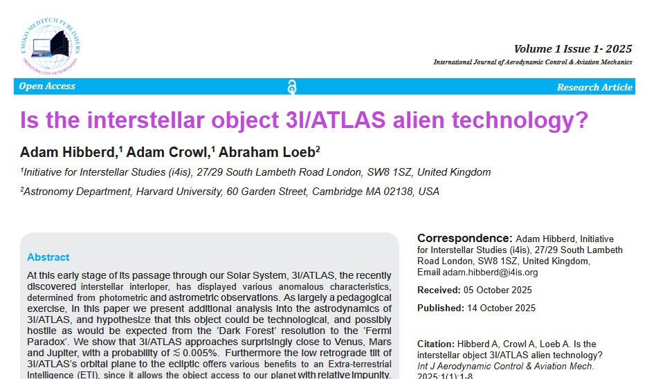 14 октября 2025 года Адам Хибберд, Адам Кроул и Авраам Леб опубликовали статью: "Является ли межзвездный объект 3I/ATLAS инопланетной технологией?" /Is the interstellar object 3I/ATLAS alien technology?/. Это провокационная и спекулятивная работа, предполагающая рассмотрение крайнего сценария, который, вероятно, неверен. Авторы открыто признают, что их гипотеза - всего лишь педагогическое упражнение, и подчёркивают, что сами её не поддерживают. Однако они считают её полезной для обсуждения и проверки.