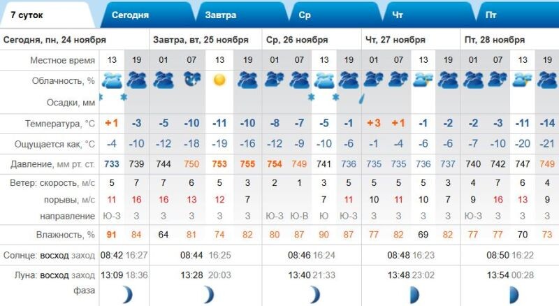 В последнюю неделю ноября жителей край ждут температурные качели Сегодня, 24 ноября, днём +1, небо будет пасмурным, снег, ветер юго-западный 5-11 м/с. Во вторник резко похолодает: ночью -5, днём ещё холоднее и -11 (по ощущениям -19), малооблачно, осадки в этот день исключены, ветер западный 5-12 м/с. В среду чуть потеплеет - ночная температура воздуха составит -8, дневная не ниже -5, пасмурно и небольшой снег, ветер южного направление до 7 м/с. В четверг снова перепад в температуре: ночью +3, днём -1, облачно и без осадков, ветер западный 5-10 м/с. В пятницу очередные капризы природы: в тёмное время суток -2, днём -11, а ощущаться будет как все -20, облачно и без осадков, ветер западный 6-13 м/с. 🇷🇺 Запад 24 в MAX