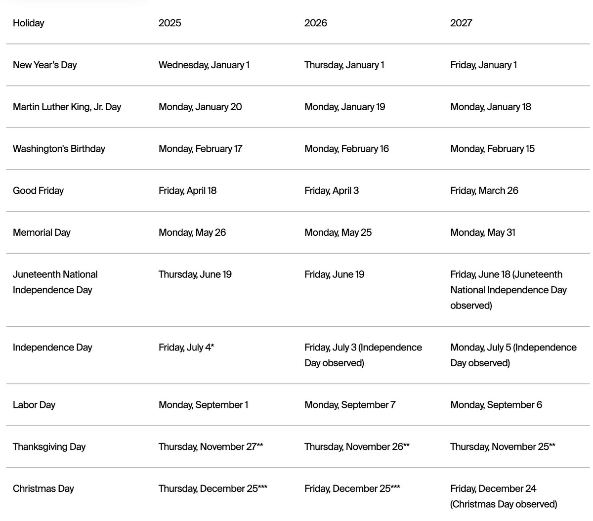 Четверг на рынках США выходной, в пятницу [black] — сокращённый торговый день