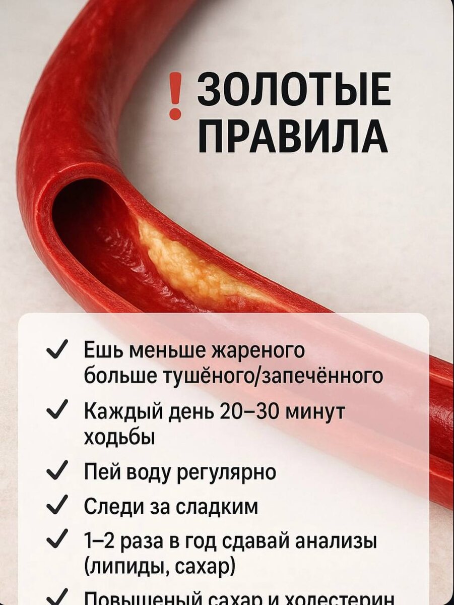 🔴Золотые правила для чистых сосудов Чтобы сосуды оставались эластичными, а кровоток - здоровым, достаточно придерживаться нескольких простых привычек: ⭐️Меньше жареного — больше тушёного и запечённого. Это снижает нагрузку на сосуды и уменьшает воспаление. ⭐️Ходьба 20-30 минут каждый день. Улучшает кровообращение и укрепляет сосудистую стенку. ⭐️Регулярное потребление чистой питьевой воды. Объём циркулирующей крови напрямую зависит от гидратации. ⭐️Контроль сладкого. Избыток сахара повреждает сосуды быстрее, чем жир. ⭐️Анализы 1-2 раза в год. Липидный профиль, сахар, общий холестерин - Ваш главный ориентир. Какое из этих правил для Вас самое сложное, а какое самое легкое?