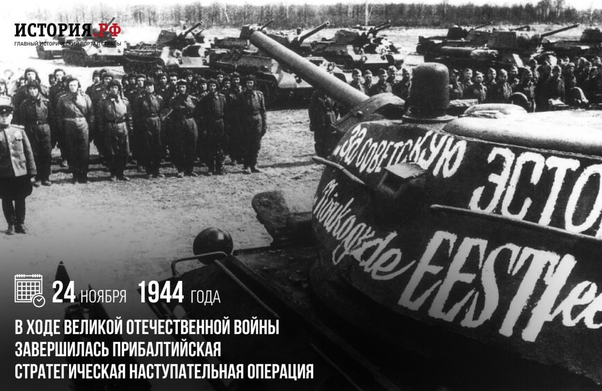 24 ноября 1944 г. В ходе Великой Отечественной войны завершилась Прибалтийская стратегическая наступательная операция. Красная армия не только освободила прибалтийские республики от немецкой оккупации, но и остановила террор, учиненный нацистами и местными коллаборационистами, который привел к гибели сотен тысяч мирных граждан и военнопленных #ПамятныеДатыВоеннойИсторииОтечества #ДеньВИстории #ГодЗащитникаОтечества #80ЛетВеликойПобеды Источник: https://vk.ru/wall-216215303_2654 Подпишитесь на наши группы ВКонтакте, в Одноклассниках, в Телеграм - читайте, смотрите и комментируйте информационные материалы, предлагайте свои! Источник: Открыть