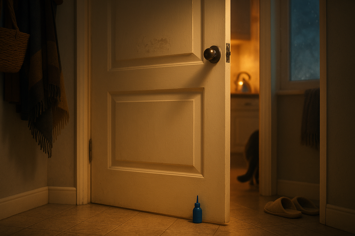 Марина, заглянув в коридор, увидела, как Алексей спокойно присаживается, приподнимает дверь и точным движением капает пару капель на петли.