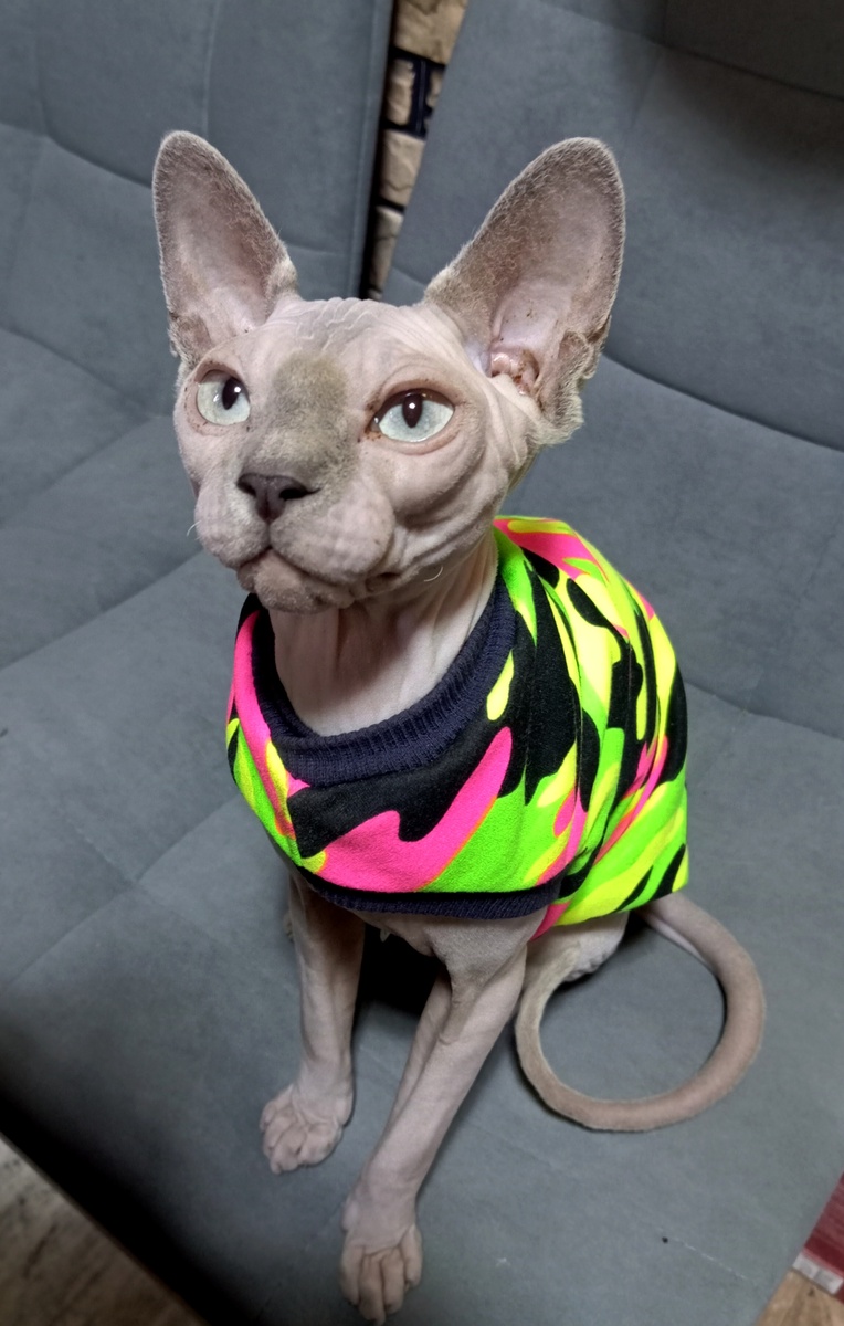 Помню, в детстве, я впервые увидела в журнале фото лысой кошки и была в диком восторге и удивлении. С этого момента я искала любую информацию об этих кошках, собирала по крупицам. Это сейчас можно зайти в интернет и найти практически что угодно, а тогда (было это в 90-х) о таком мы даже не мечтали. Так вот, с этого момента кошка сфинкс стала моей мечтой. Почему я так поздно смогла её воплотить? Даже не знаю, кошки у нас дома жили уже много лет. Ничего особо не мешало сделать это раньше, но исполнила я ее на свой 37 день рождения. Так в нашем доме появилась лысая кошка Сосиска породы канадский сфинкс. Просто детский восторг. Я уже много раз читала, что у этих кошек, как и у мейн-кунов, собачий характер, но теперь я могла лично в этом убедиться. Сосиска сразу выбрала меня хозяйкой и постоянно тусила на моем плече, когда я была дома. Спала только под одеялом (ну понятно, холодно ж), прижавшись ко мне. Конечно сразу же была куплена гора одежды, мы же девочки.))) Но, как показала практик